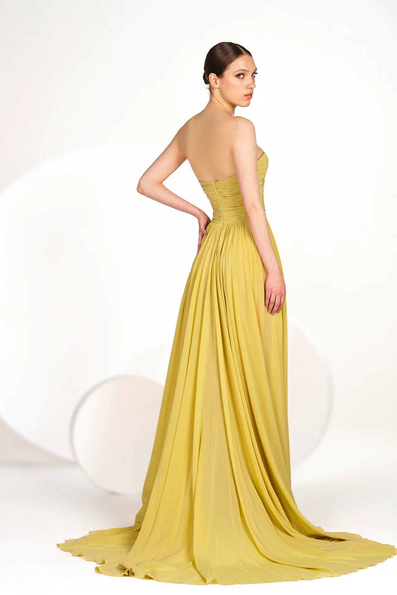 Mustard yellow strapless flared dress, sweetheart neckline, fitted bodice with pleats, brown sequin embroidery under chest, flared pleated skirt, front side slit.