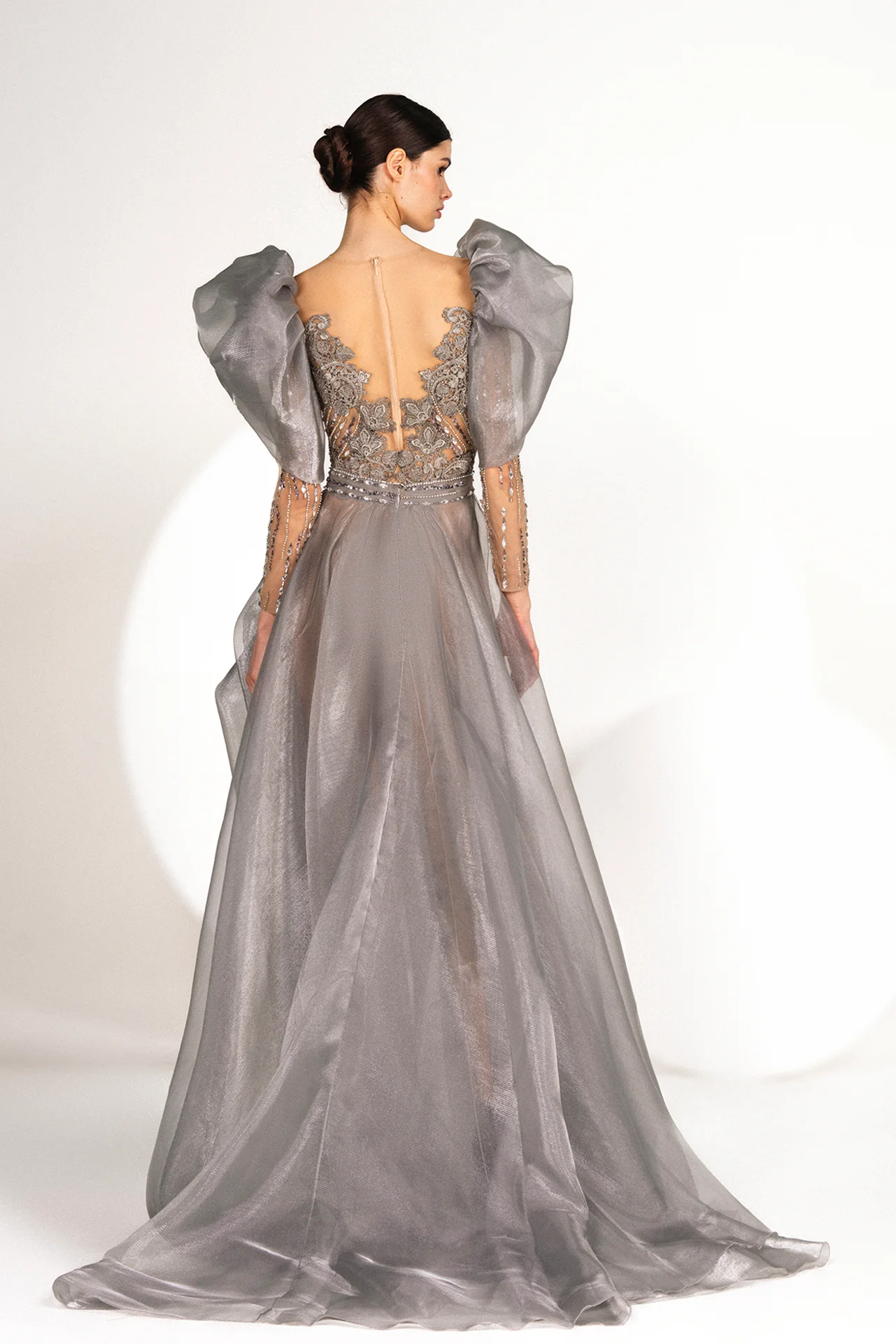 Gray tulle evening dress, embroidered corset with delicate floral motifs and Swarovski stones, long fitted sleeves with shoulder ruffles, waist belt, flared skirt with side draping.
