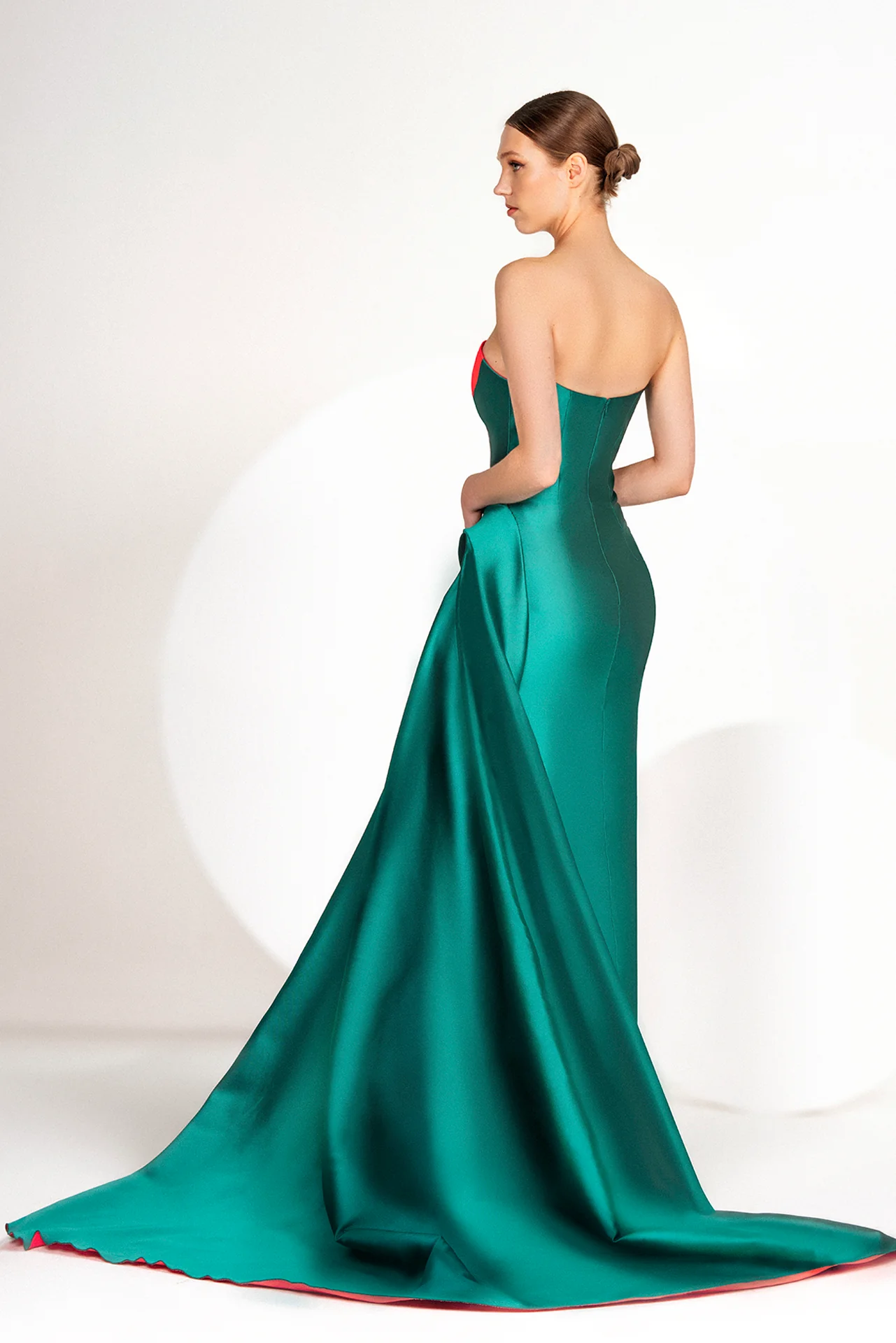 Emerald green and coral strapless taffeta dress with heart-shaped chest, voluminous asymmetrical slit train, draped skirt at side waist, long zipper back.