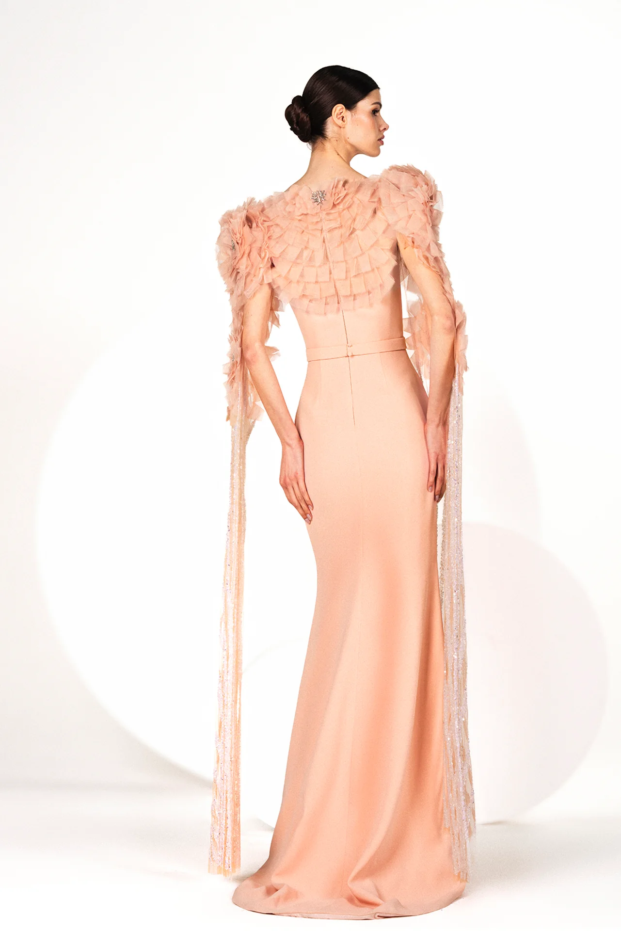 Light pink crepe mermaid dress, V neckline, fitted bodice, thin banded waist, organza ruffle cape sleeves shaped like roses with Swarovski crystal endings, front slit, layered ruffles on the back.