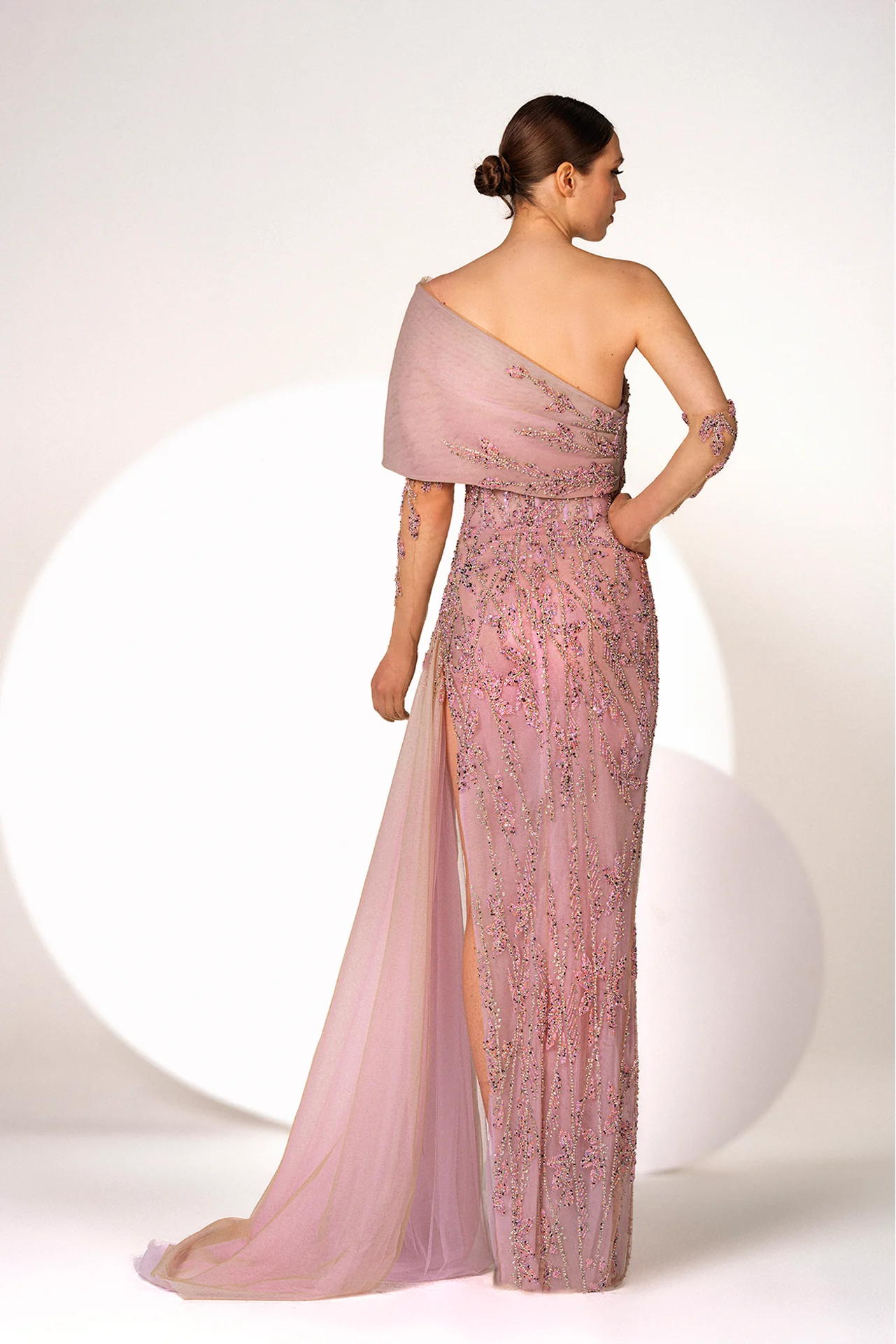 Lilac satin one-shoulder dress, asymmetric neckline, fitted skirt, floral motifs embroidery with silver stones, side slit, side tulle train, tulle embroidered gloves.