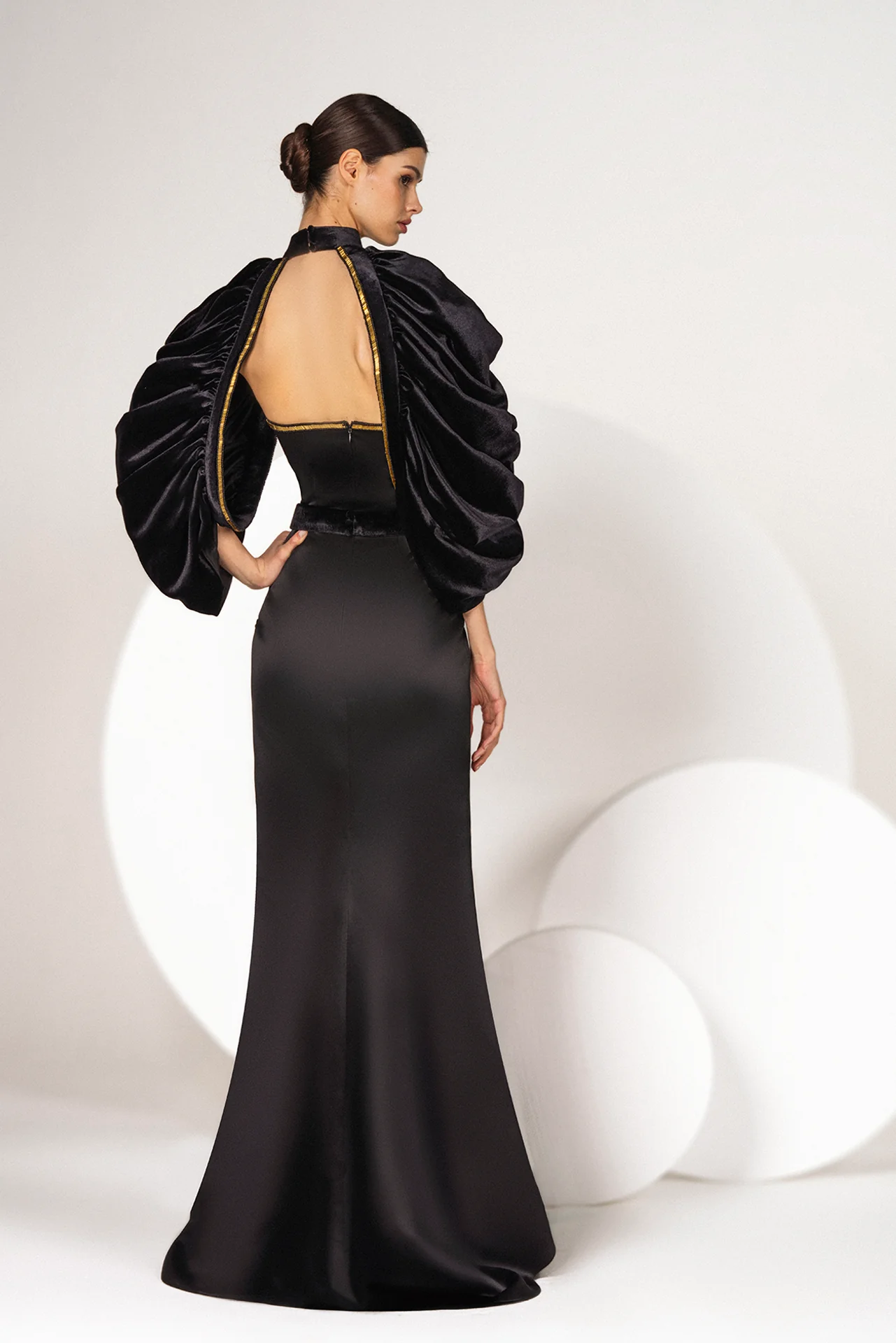 Black strapless satin dress, narrow V neckline, fitted bodice, velvet thin banded waist, fitted skirt, front slit, velvet bolero with puffy bell sleeves, metallic gold cylinder beads around edges.