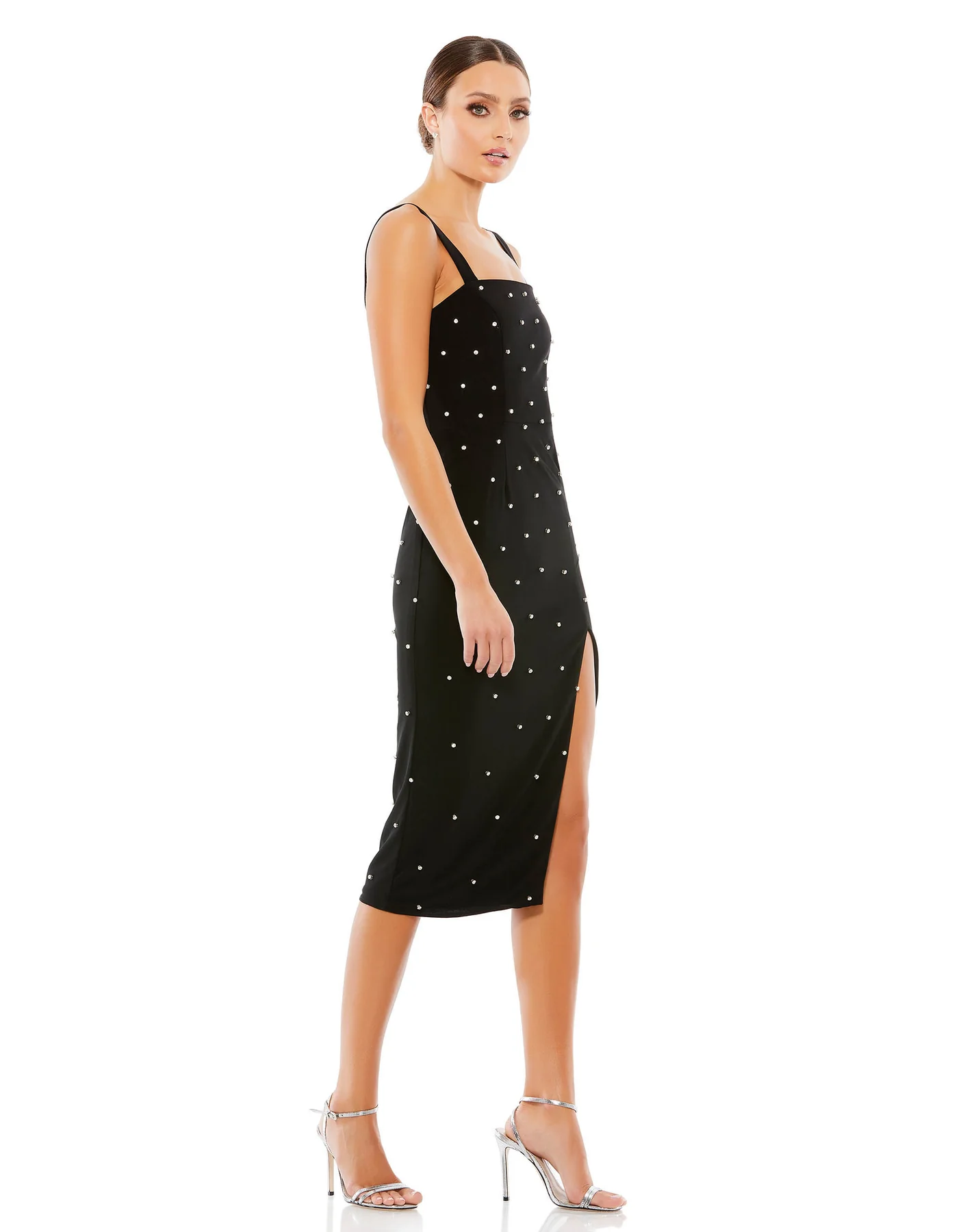 SLEEVELESS RHINESTONE ENCRUSTED SQUARE NECK MIDI DRESS