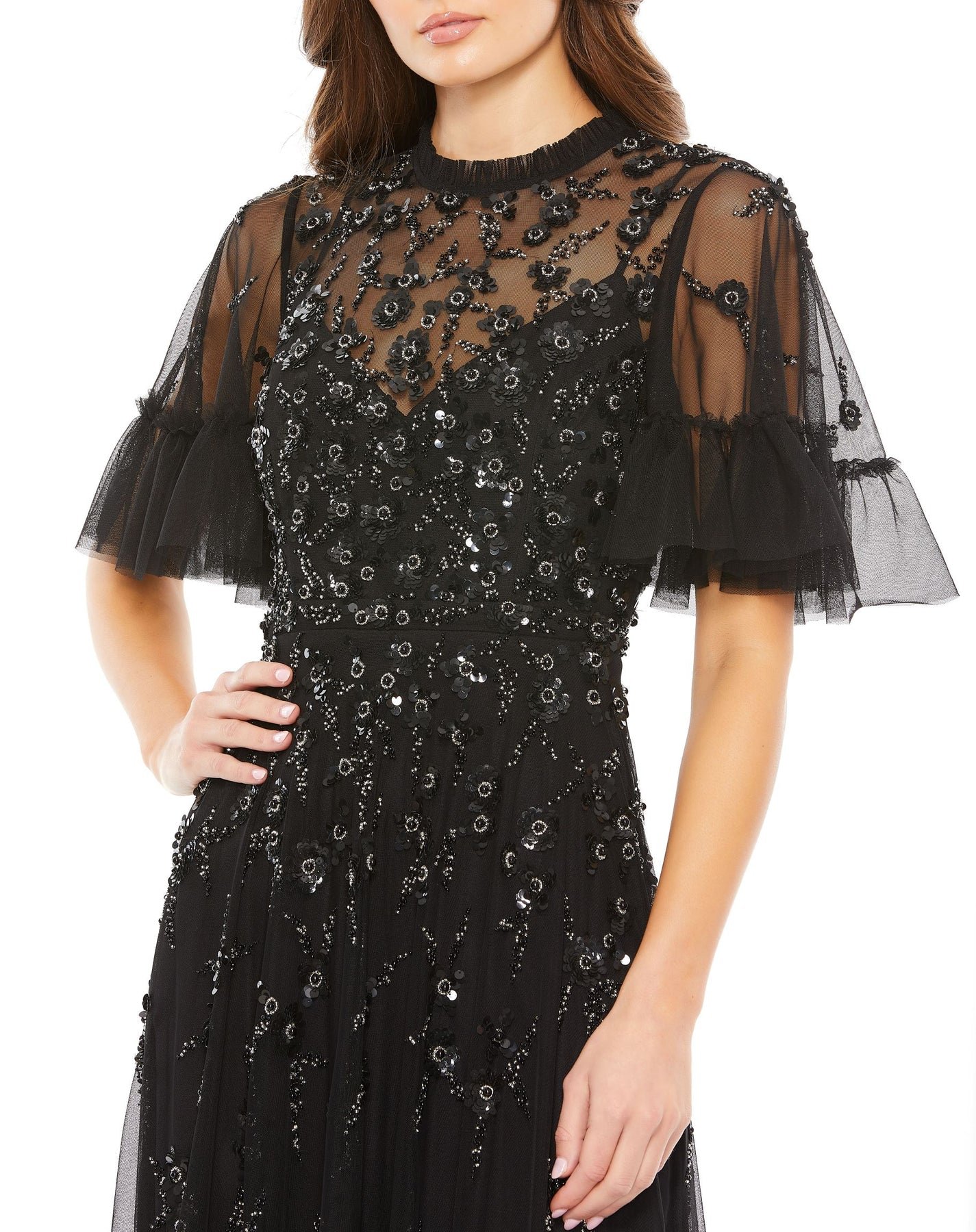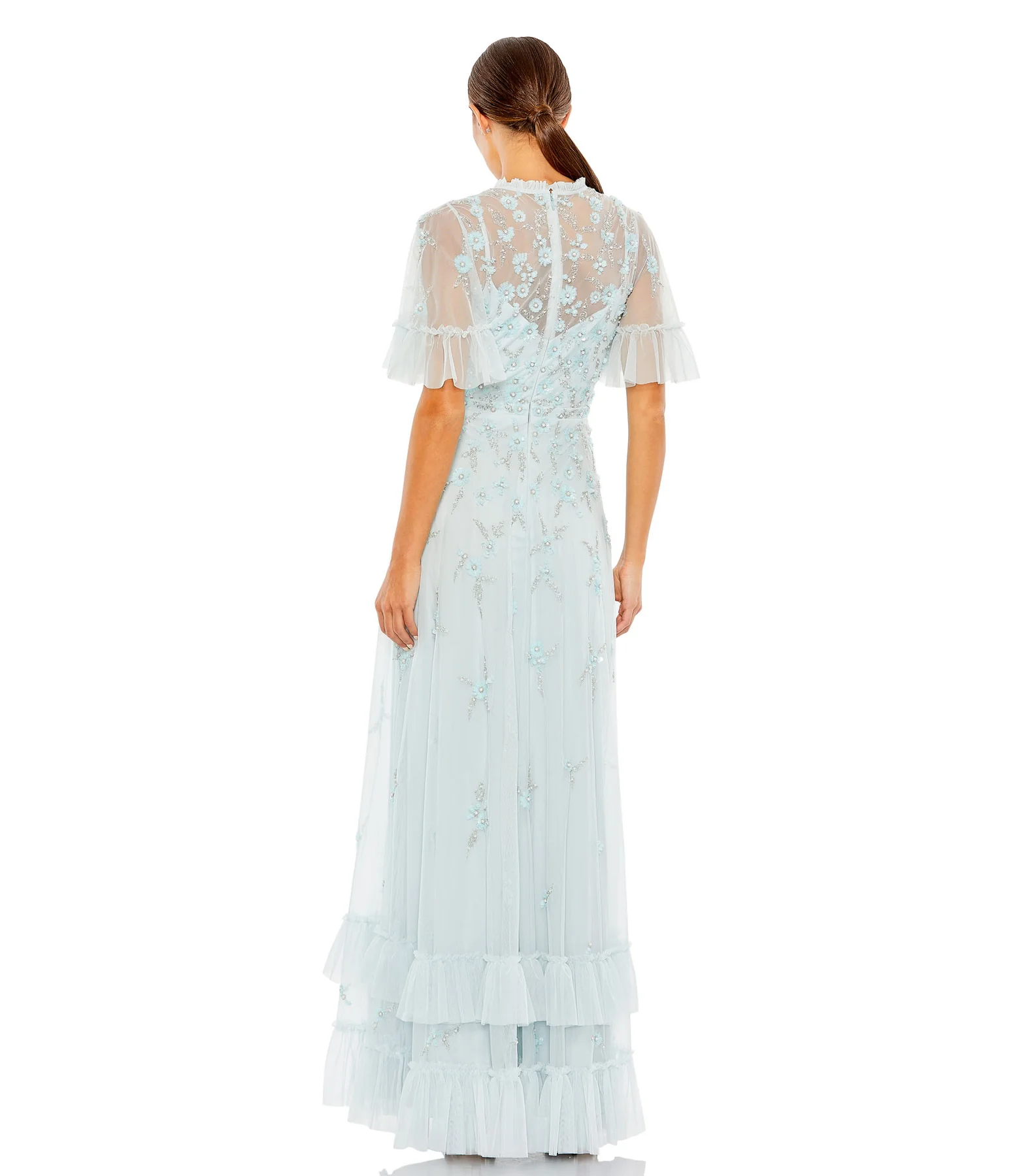 RUFFLED FLORAL EMBELLISHED FLUTTER SLEEVE A-LINE GOWN