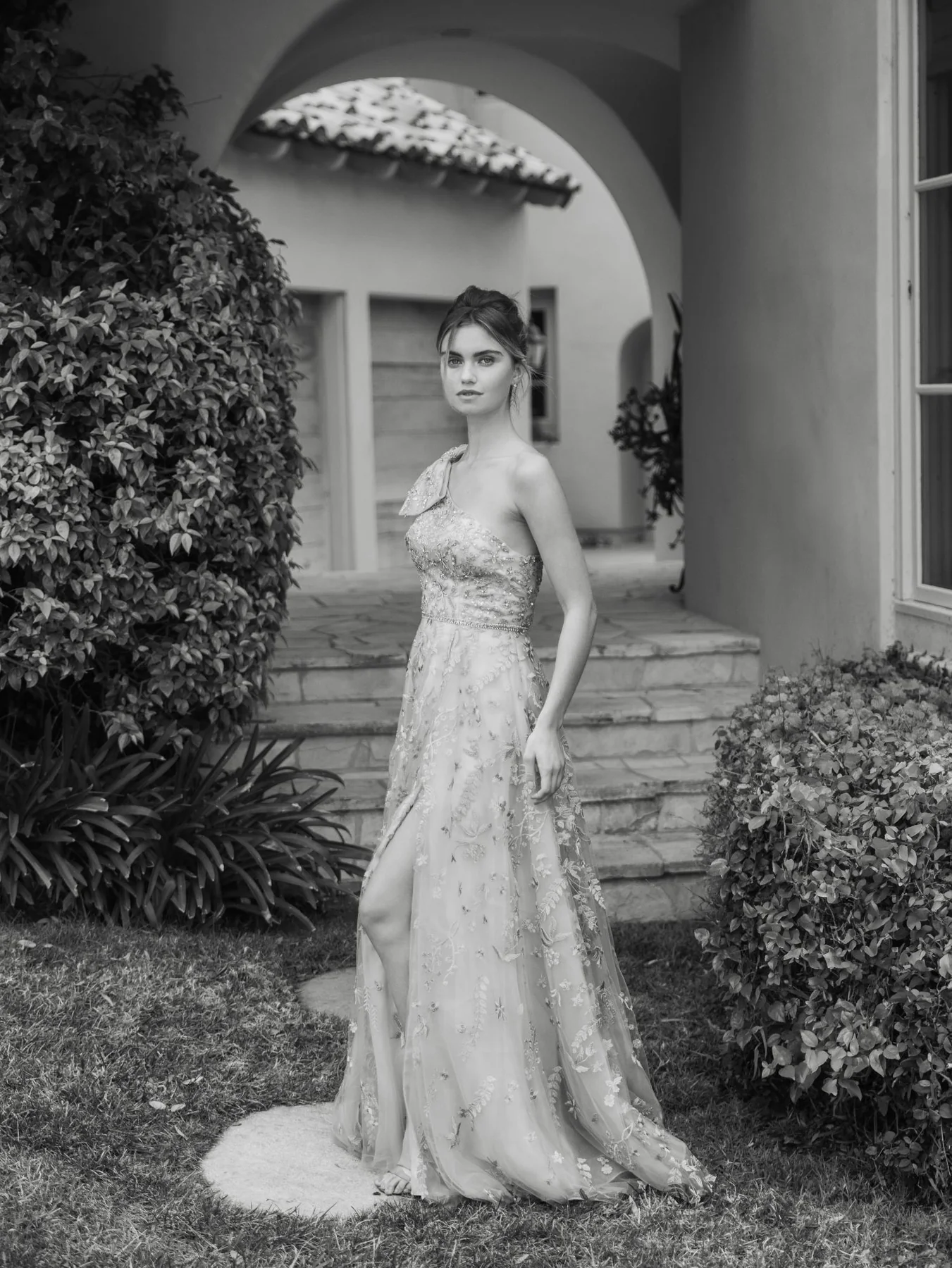 Serve up head-to-toe beauty in this incredible gown. Made from shimmery, botanical-embroidered tulle, the feminine gown is detailed with rhinestone trim at the waist and topped with a feminine full bow at the single shoulder. It’s glamorous, romantic—and with a high leg slit—flirty, too.