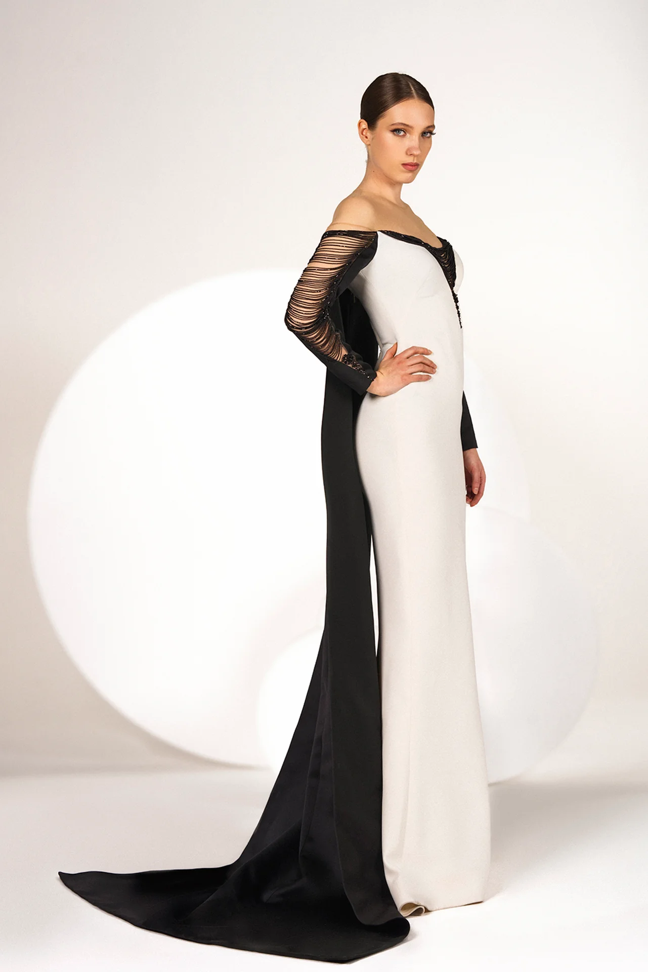 Black-and-White off-the-shoulder mermaid dress with cascading fringes on neckline and sleeves, adorned with shiny black silene, chapel train, intricate sequins, and flower-like patterns.