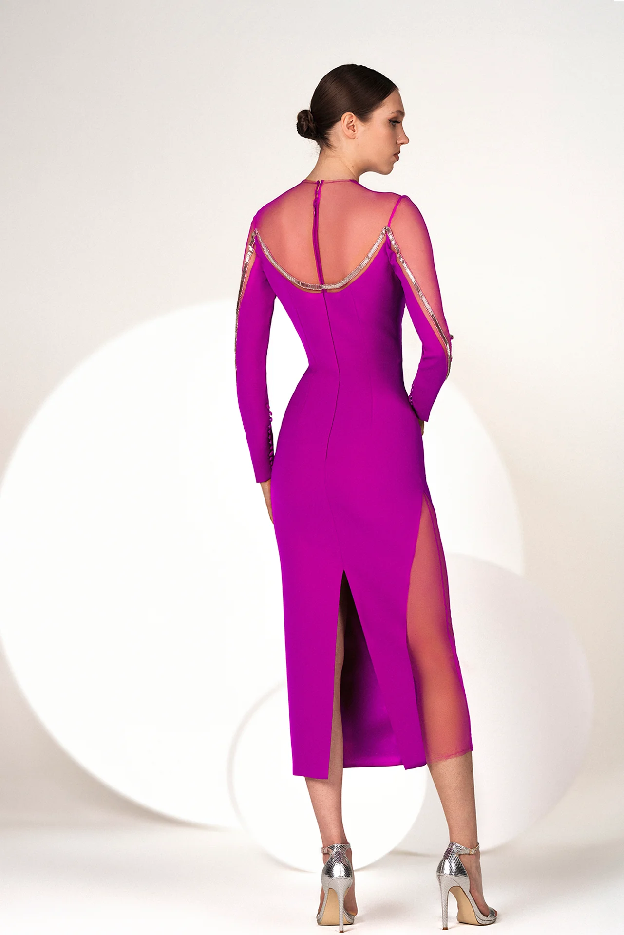 Fuchsia crepe midi dress, jewel neckline, long sheer tulle sleeves with buttons and subtle silver sequin line, fitted midi skirt, sheer tulle slit, sheer tulle back.