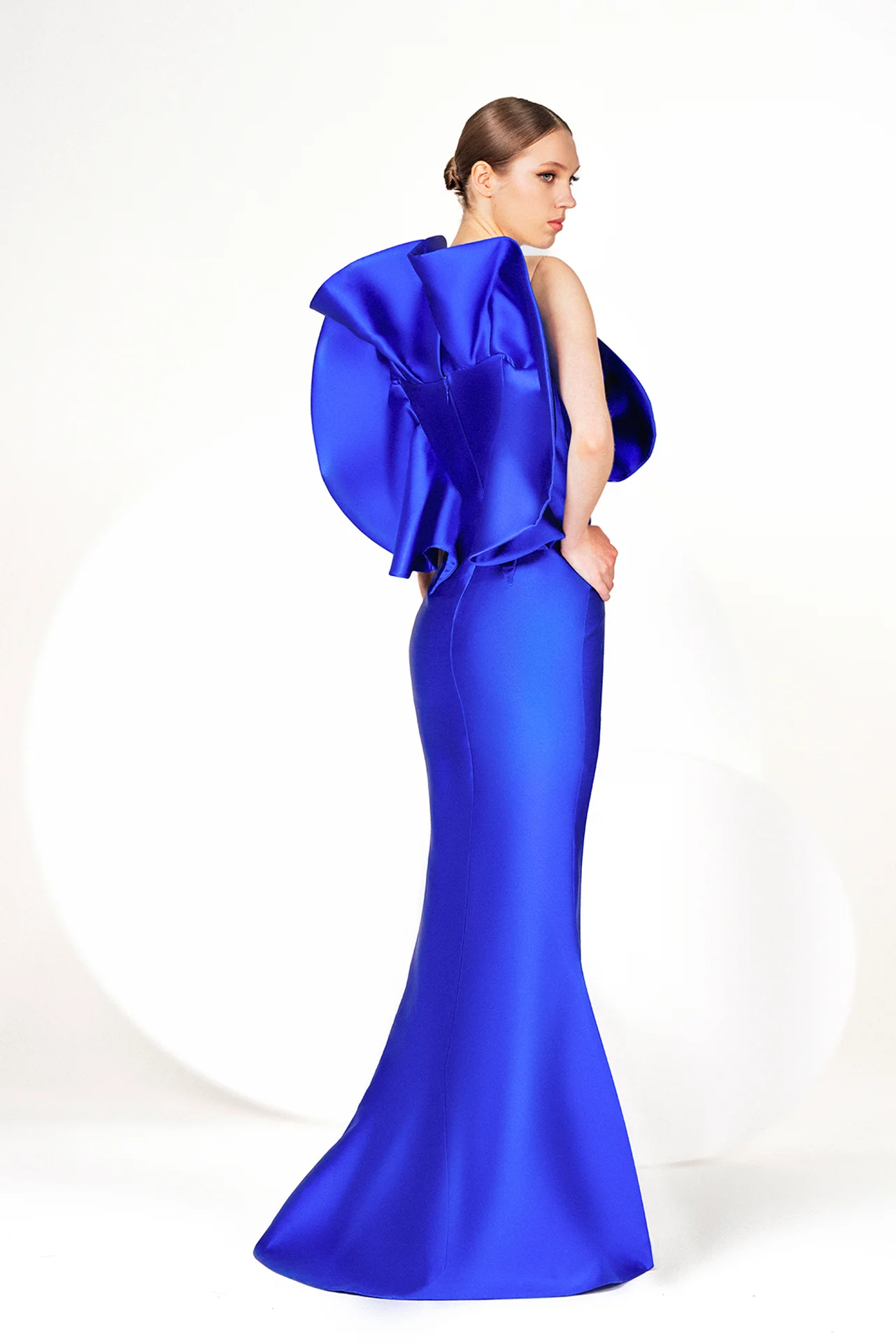 Royal blue cadi evening dress with a straight across neckline, symmetrical butterfly-shaped ruffles on the waist, black embroidery from bust to waist, extending to the back.