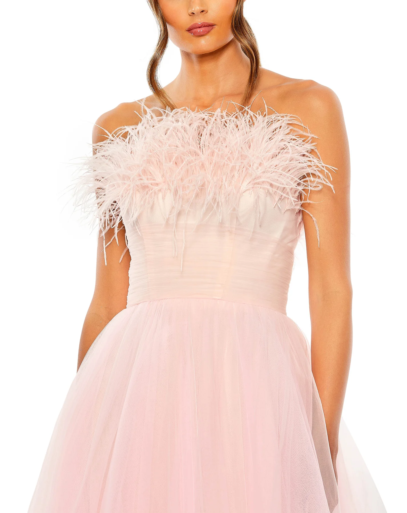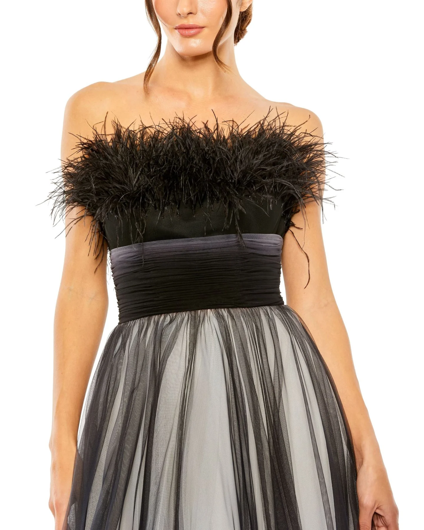 STRAPLESS FEATHER BODICE TULLE GOWN