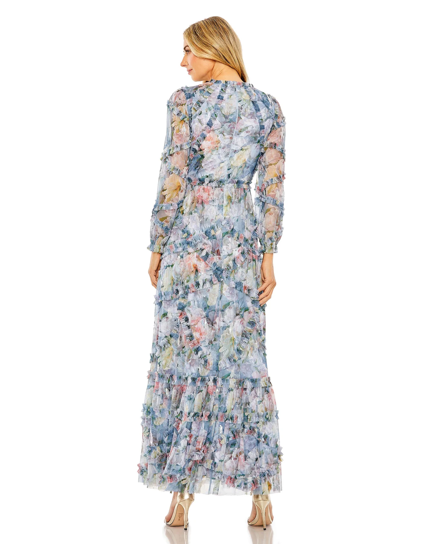LONG SLEEVE HIGH NECK RUFFLE DETAIL GOWN