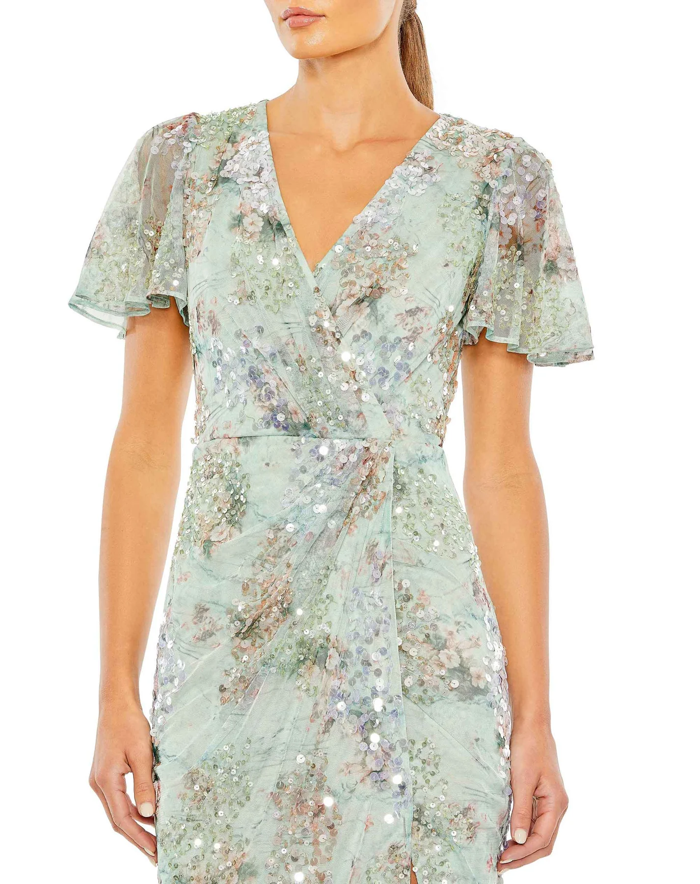 EMBELLISHED BUTTERFLY SLEEVE FAUX WRAP GOWN