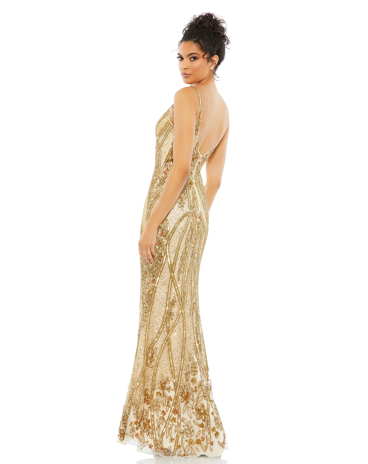 Steal the spotlight in this floral hand embellished gown. The sleek dress is cut with a plunging neckline and styled with delicate, barely-there straps and hand embellished beads that follow the curves of your body