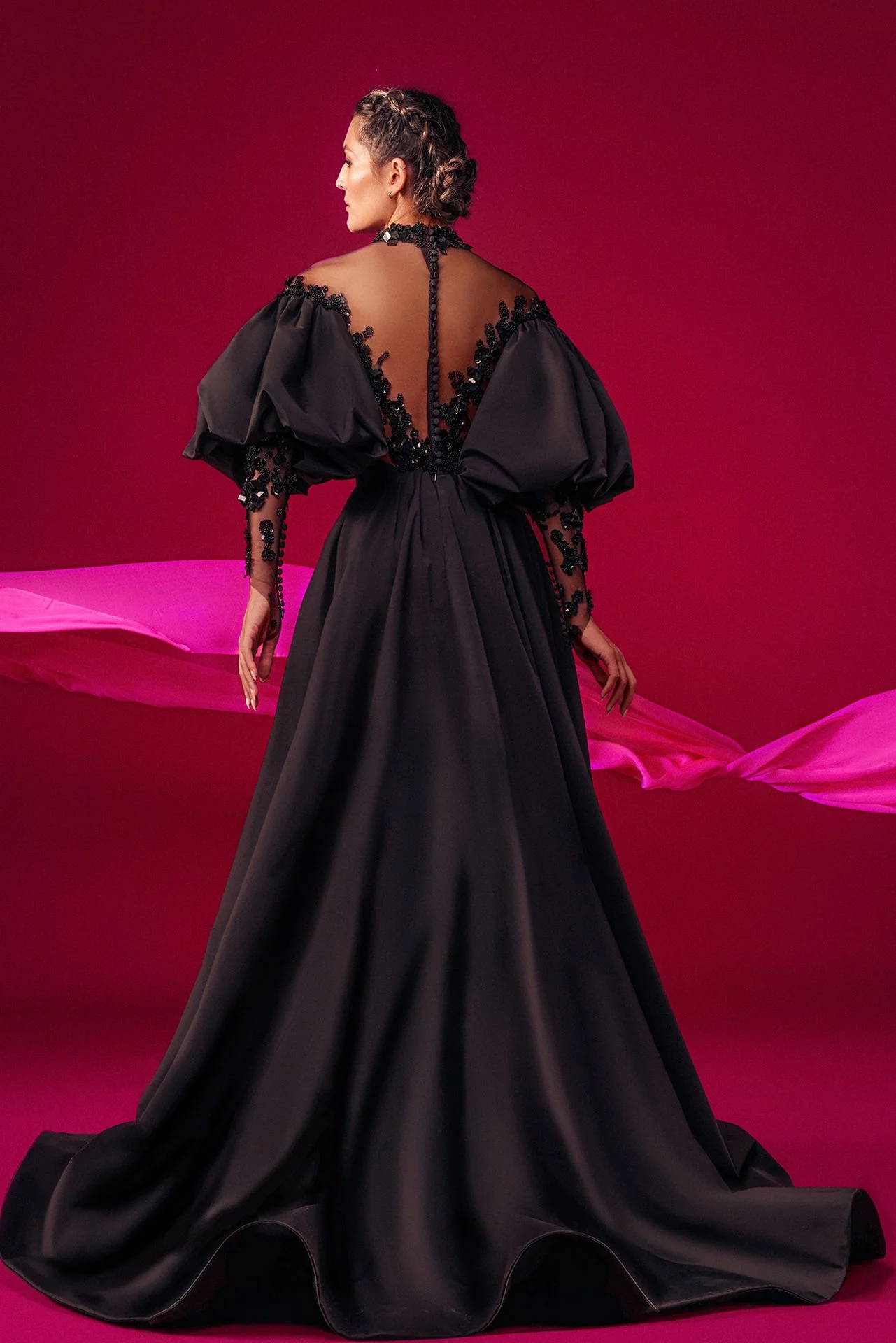 Puffy Taffetas sleeves on the shoulders that elongates till the wrist with bold embroidered sheer black tulle and ends up with a glove on the thumb and finely buttoned. A dramatic sheer plunging V-shape backline embroidered on the edge of the V and crossed with a row of satiny buttons.