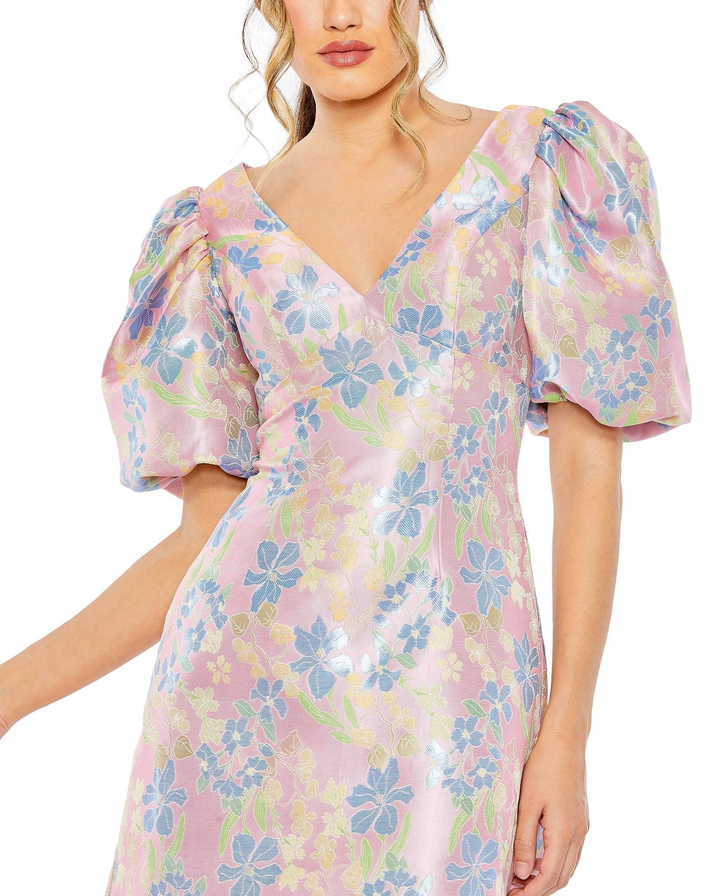 FLORAL PUFF SHOULDER BROCADE MINI DRESS