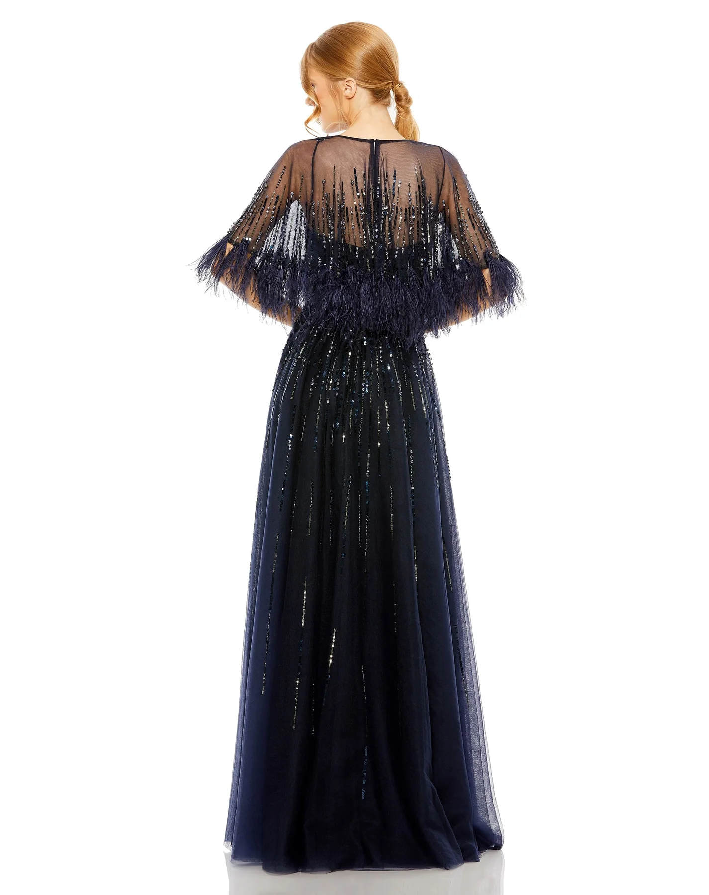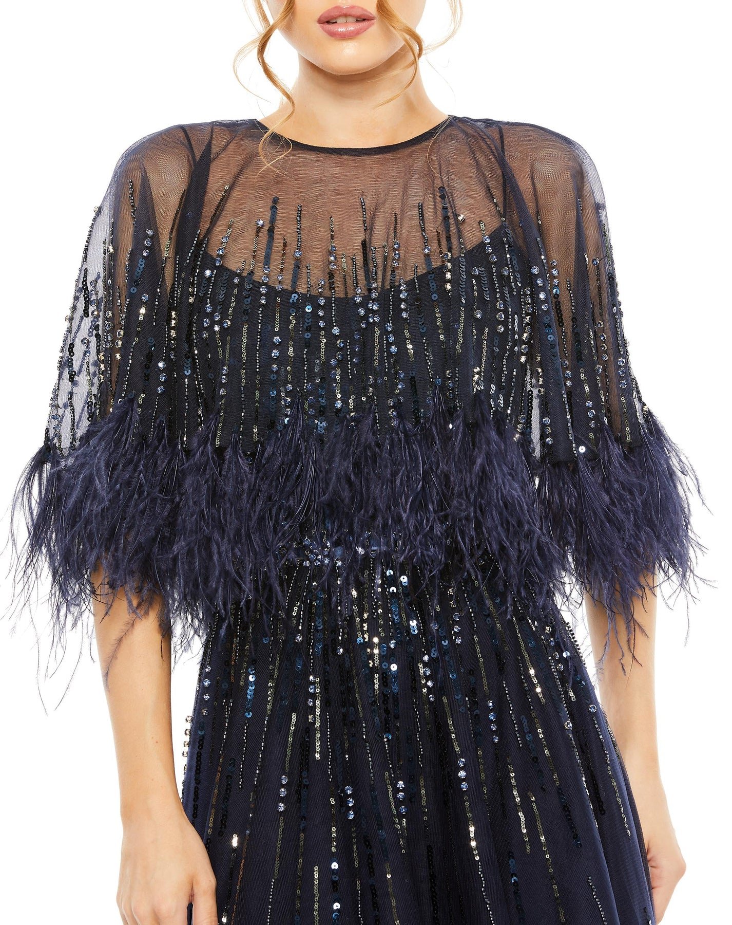 - Feathered cape sleeves