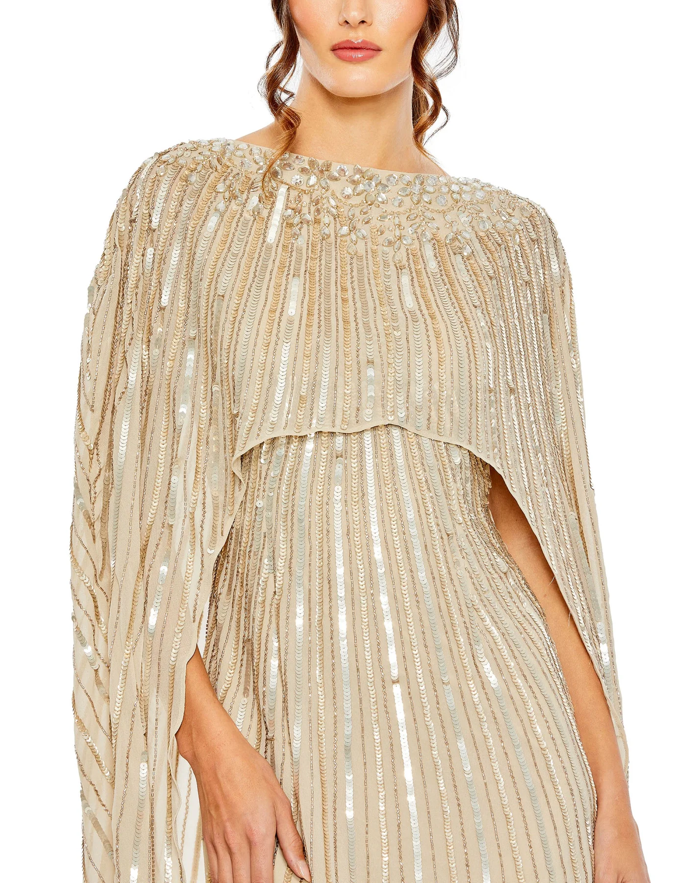EMBELLISHED COLUMN CAPE GOWN