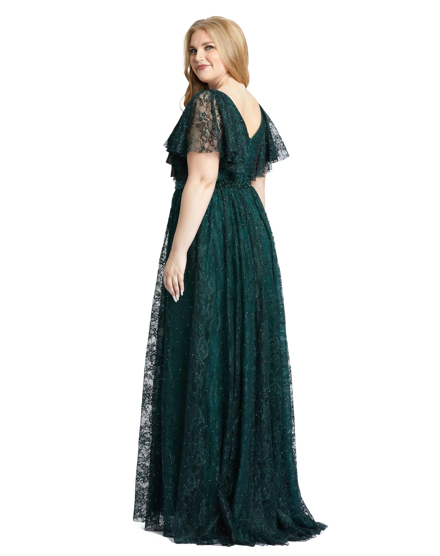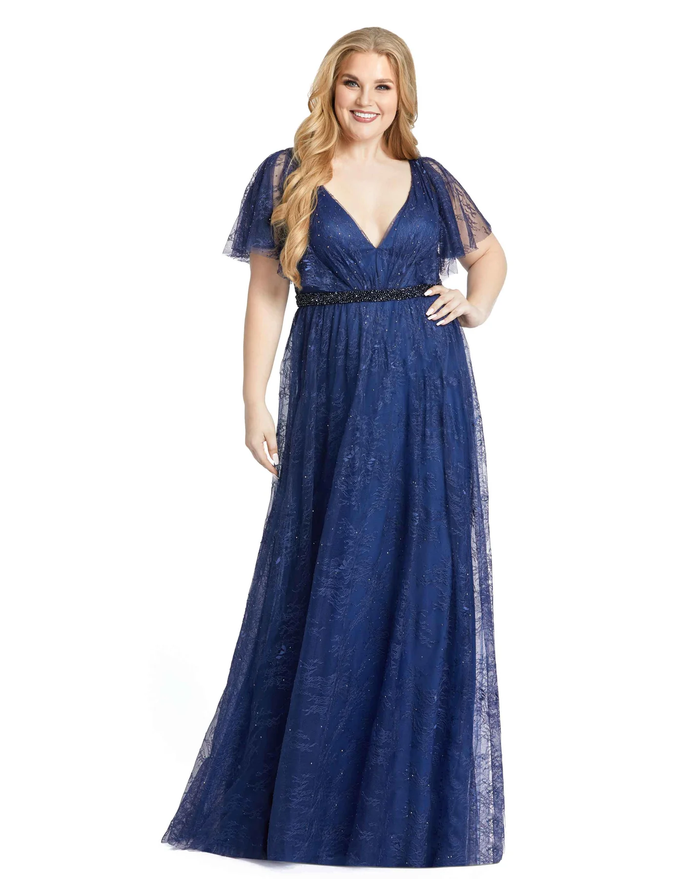 Mac Duggal Embellished lace fabric (100% polyester)Fully lined through bodice and skirt; sheer unlined sleevesV-necklineFlutter sleevesBeaded waist detailConcealed back zipperApprox. 62.5" from top of shoulder to bottom hem Available in Midnight and EmeraldStyle #67435