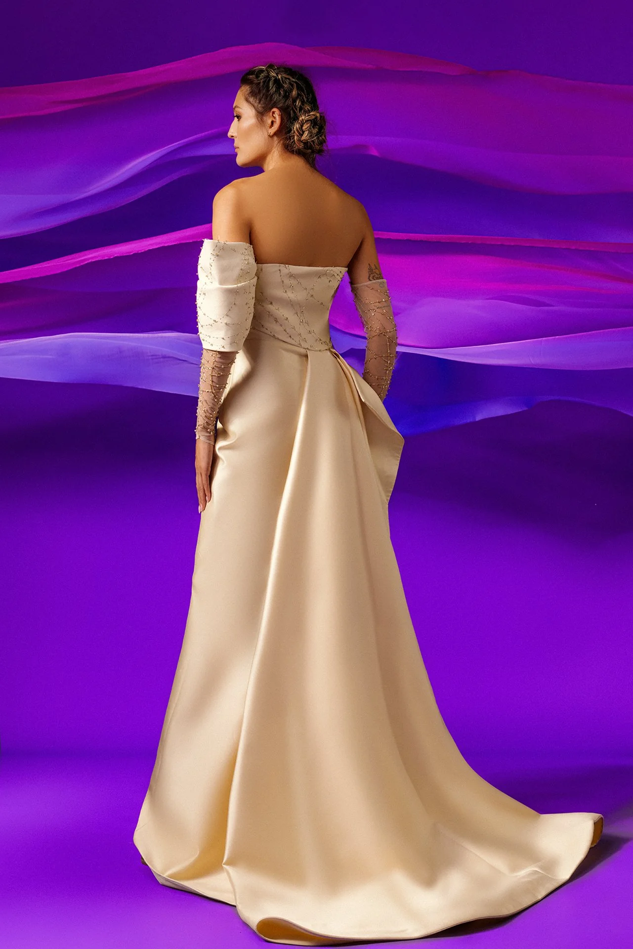 Off-shoulder off-white evening dress with a sweetheart draped jacquard bustier embroidered with gold lurex and white cady fluffy skirt with a thigh high asymmetric slit cascading on one side. The color meaning behind off white conveys simples, naturalness, innocence, and serenity. A puffy detached jacquard embroidered with gold lurex, draped sleeve and fingerless sheer tulle choices. Gold lurex represent strong and resistant. The cady skirt like it has an over skirt flowing into a sweep lengths. An ideal dress for a cocktail and naturalness look.