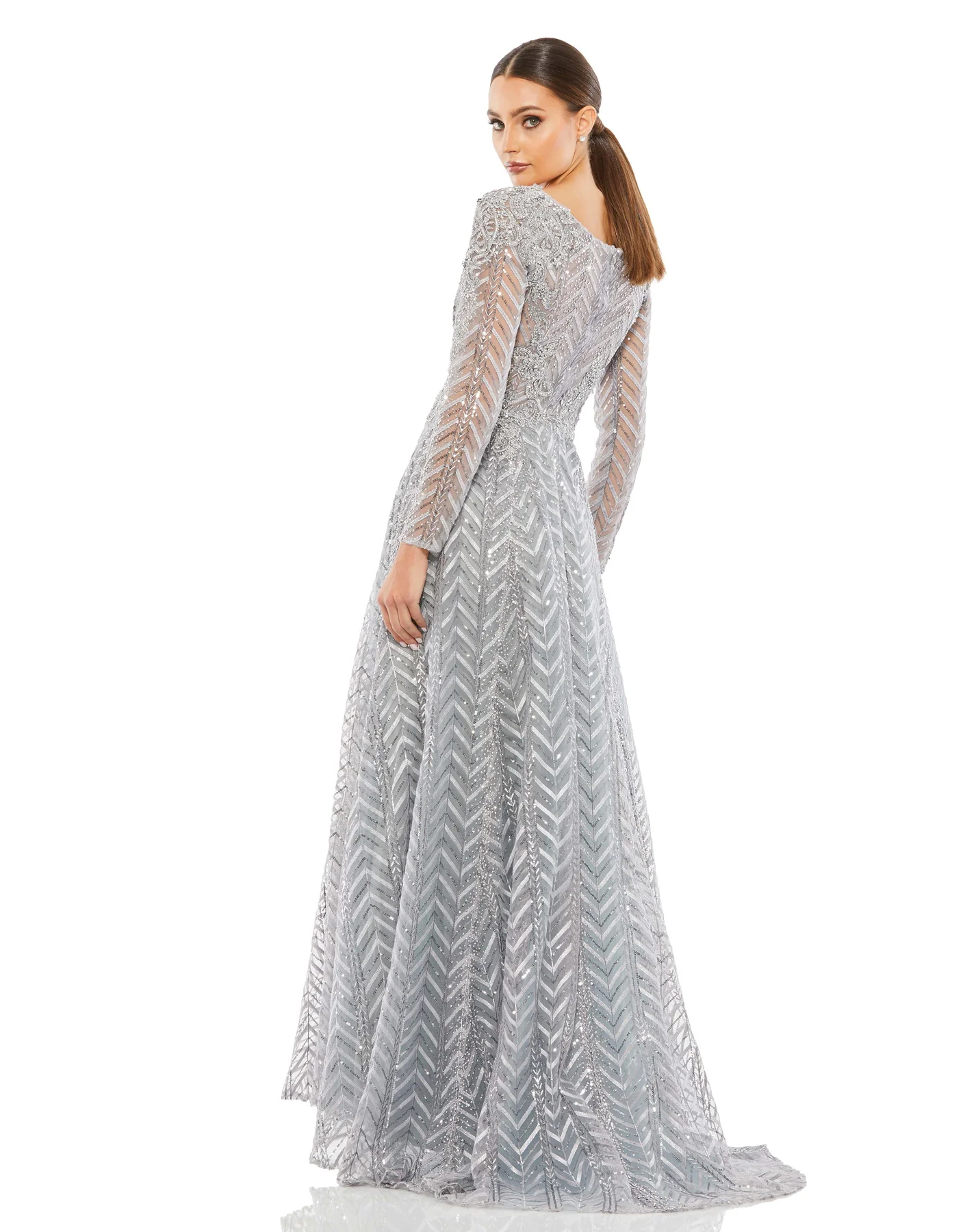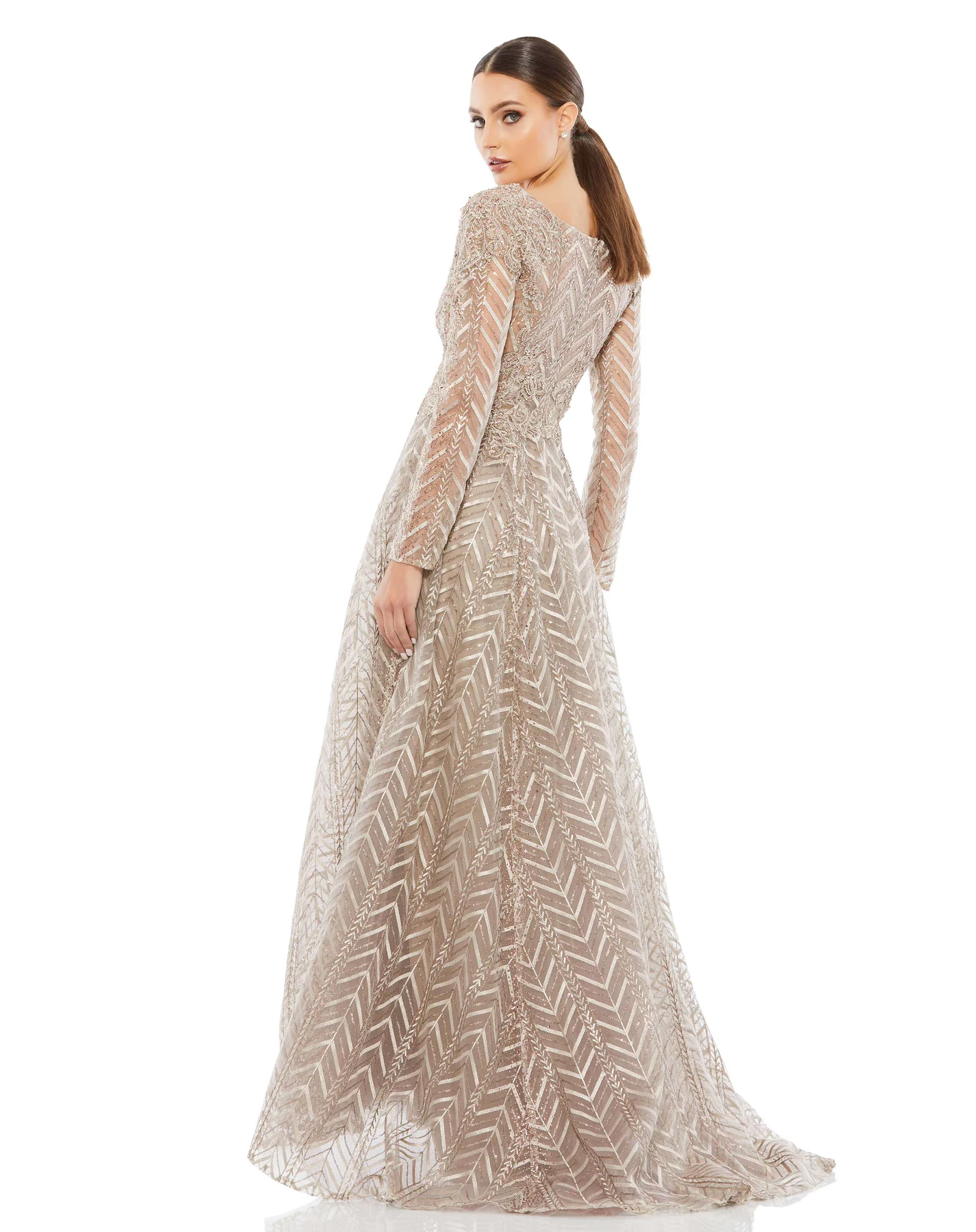 Embellished chevron-and-floral embroidered evening gown features semi-sheer illusion sleeves and bodice, a plunging v-neckline, and a floor length a-line skirt with a sweeping train.