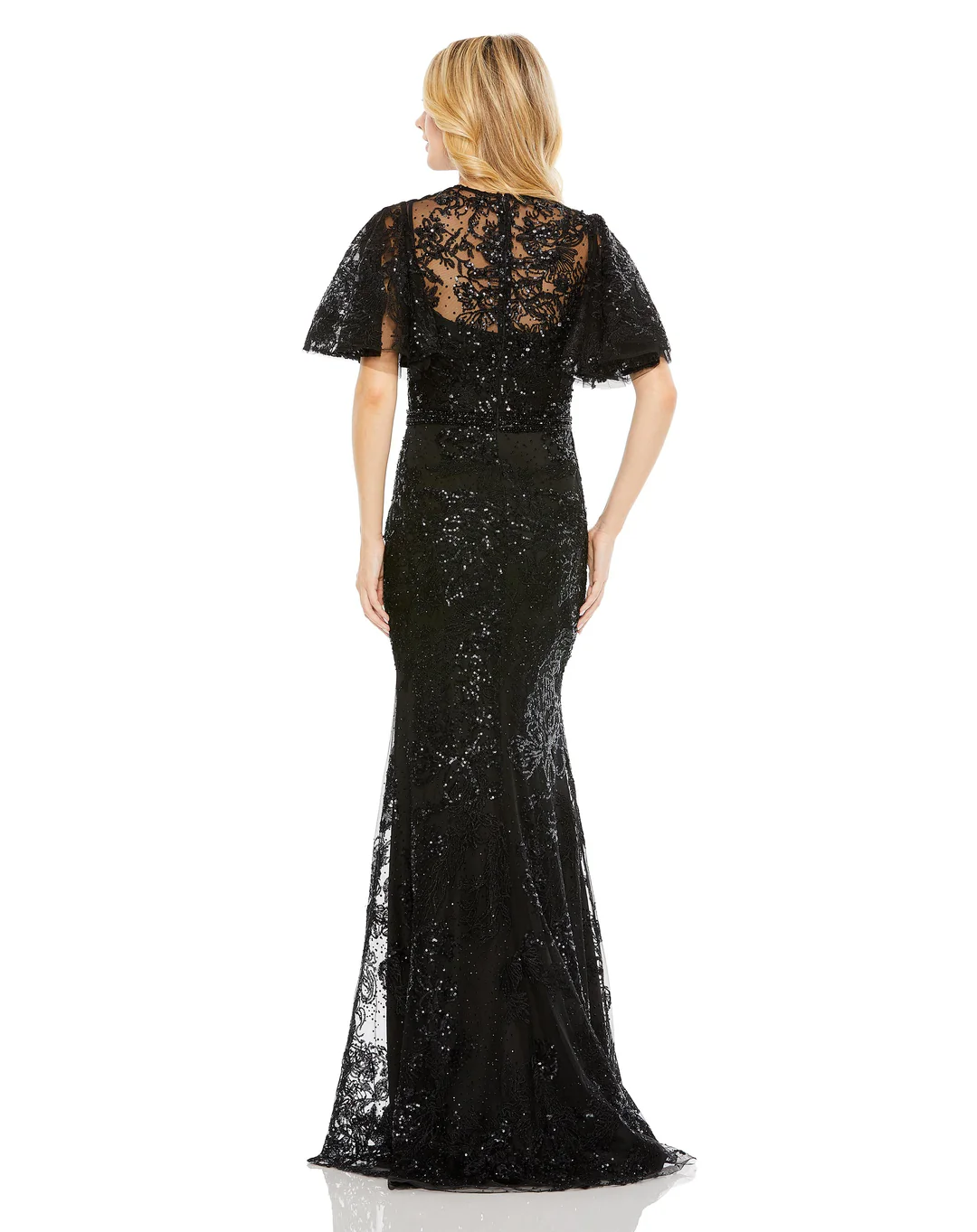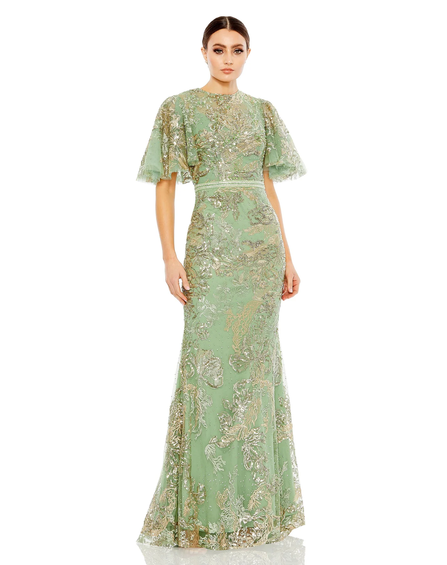EMBELLISHED FLUTTER SLEEVE HIGH NECK GOWN