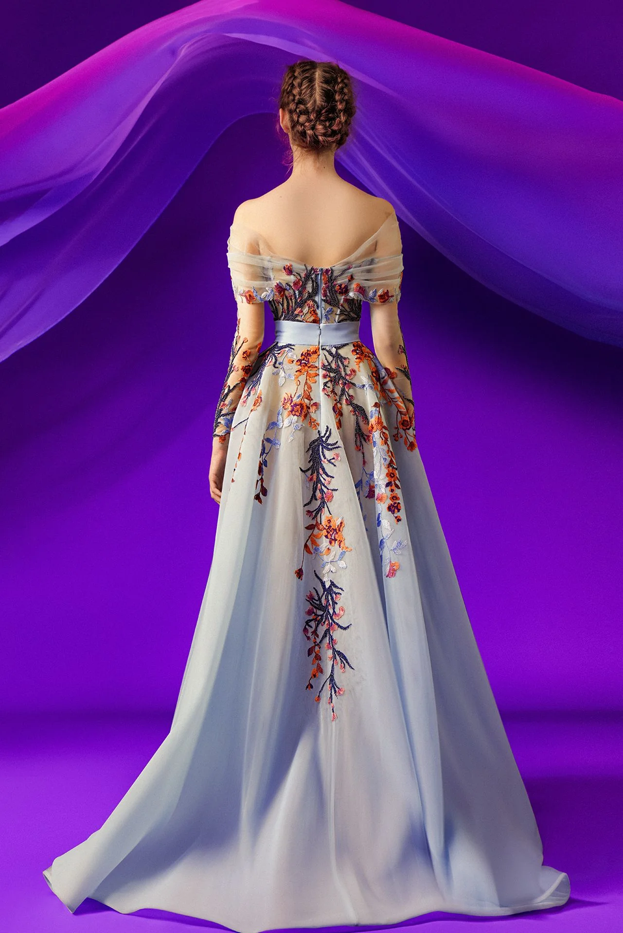 Off-shoulder baby-blue top with attached sheer tulle sleeves and a silk embroidery with multicolored floral and foliage patterns on the bust and sleeves. This silk embroidery of navy, baby blue, red and orange will form a romantic and sensual combination, ornamented with pearls of the same color. The long maxi skirt has a thigh-high slit and is defined on the waist with a satiny baby blue belt. The floral and foliage pattern is flopping to the floor in a sweep train and a unified baby blue color on the end edges. An ideal dress for a cocktail and romantic look!