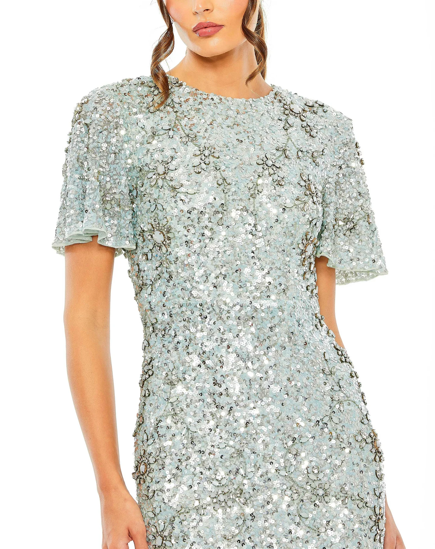 FLUTTER SLEEVE SEQUIN HIGH NECK DRESS