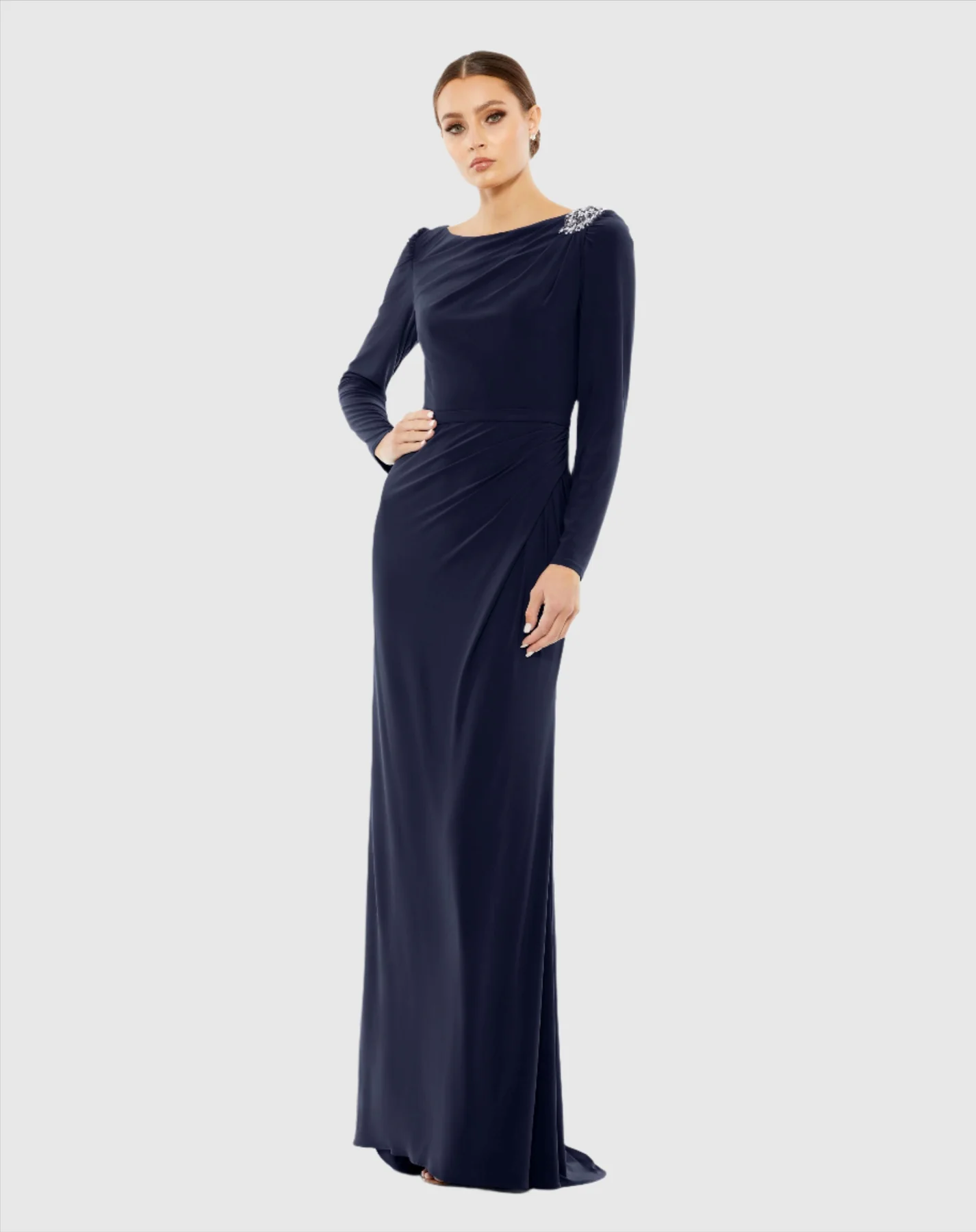 DRAPED BATEAU LONG SLEEVE TRUMPET GOWN
