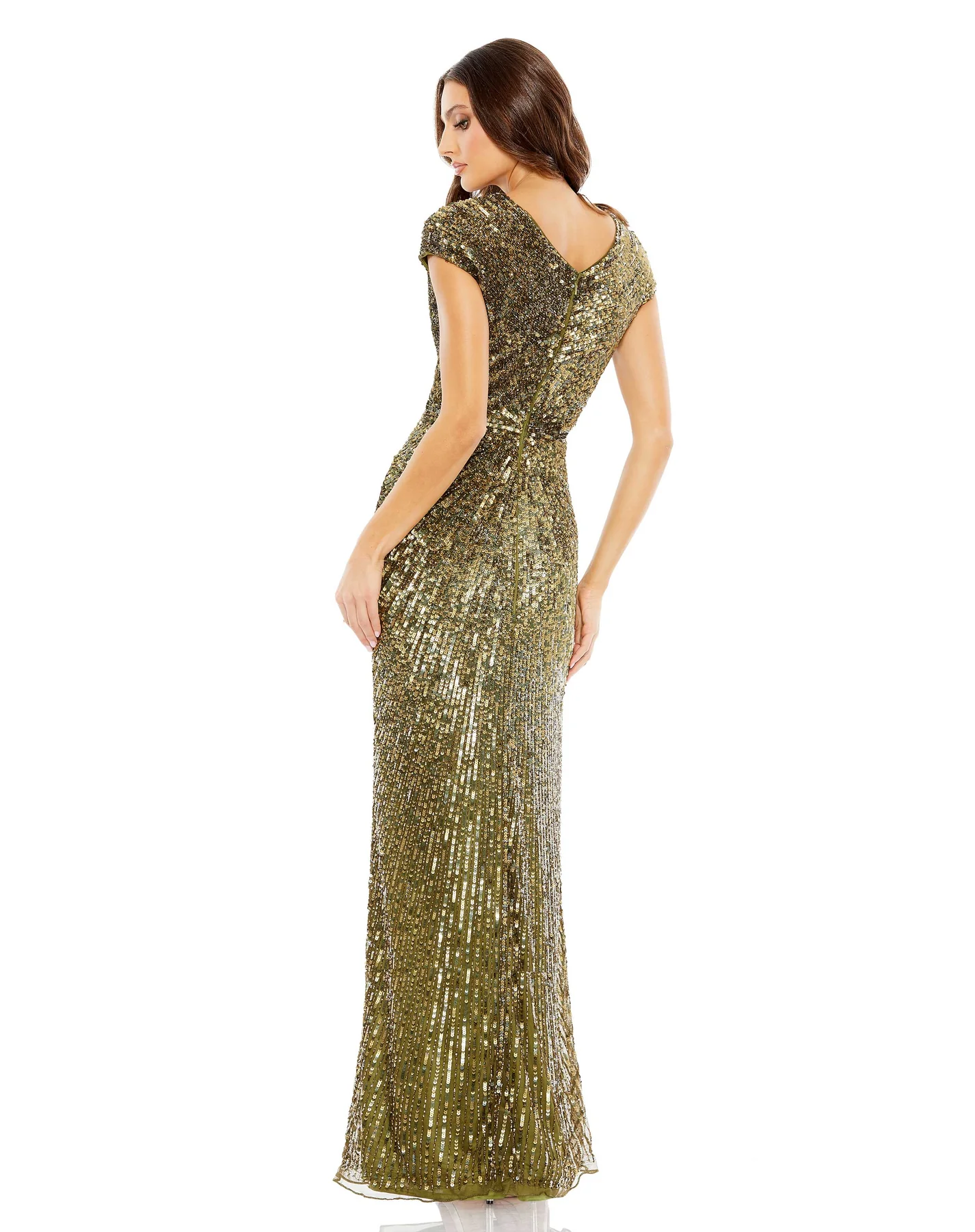 SEQUINED FAUX WRAP CAP SLEEVE GOWN