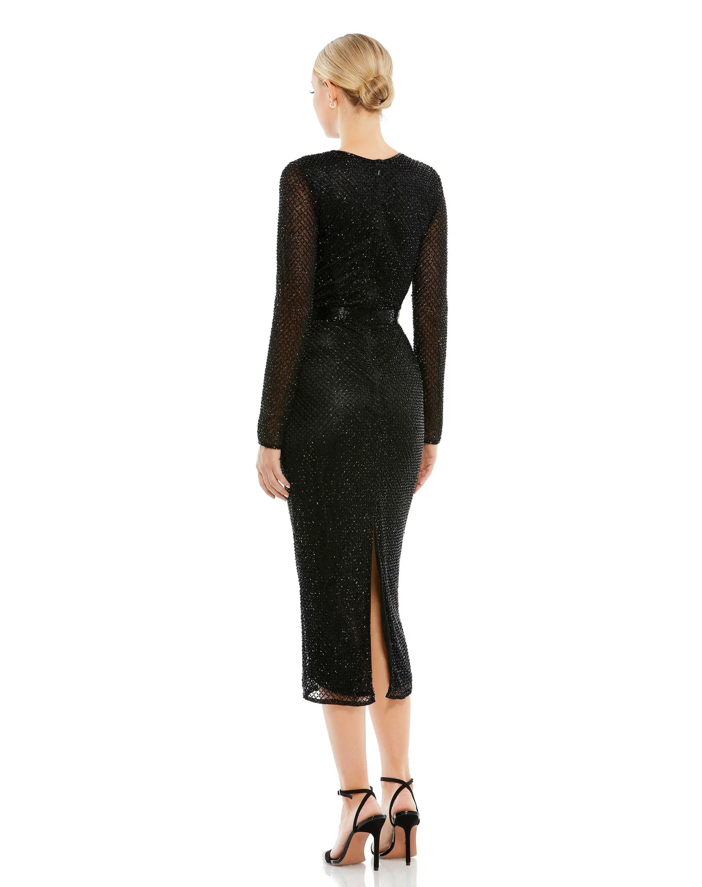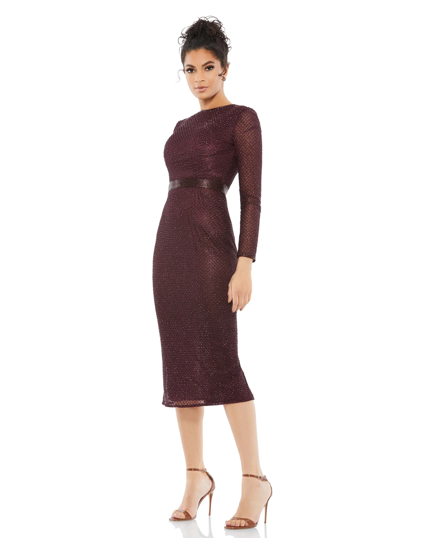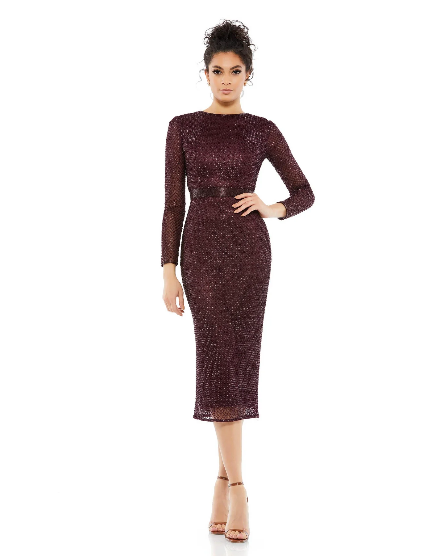 LONG SLEEVE LATTICE BEADED MIDI COCKTAIL DRESS