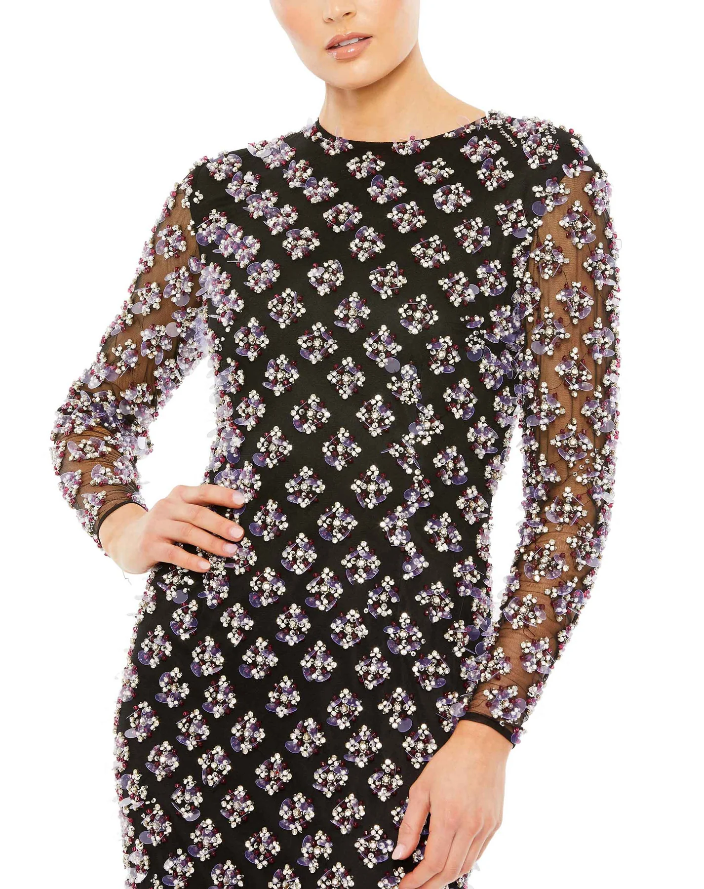 Look and feel luxurious in this Mac Duggal long-sleeve gown. The couture quality hand-beaded dress is crafted from 100% polyester mesh fabric with a full body lining and sheer unlined sleeves. A high neckline and all-over intricate pattern compose a sophisticated luxury with hand-stitched sequins, beads, and rhinestone embellishments.