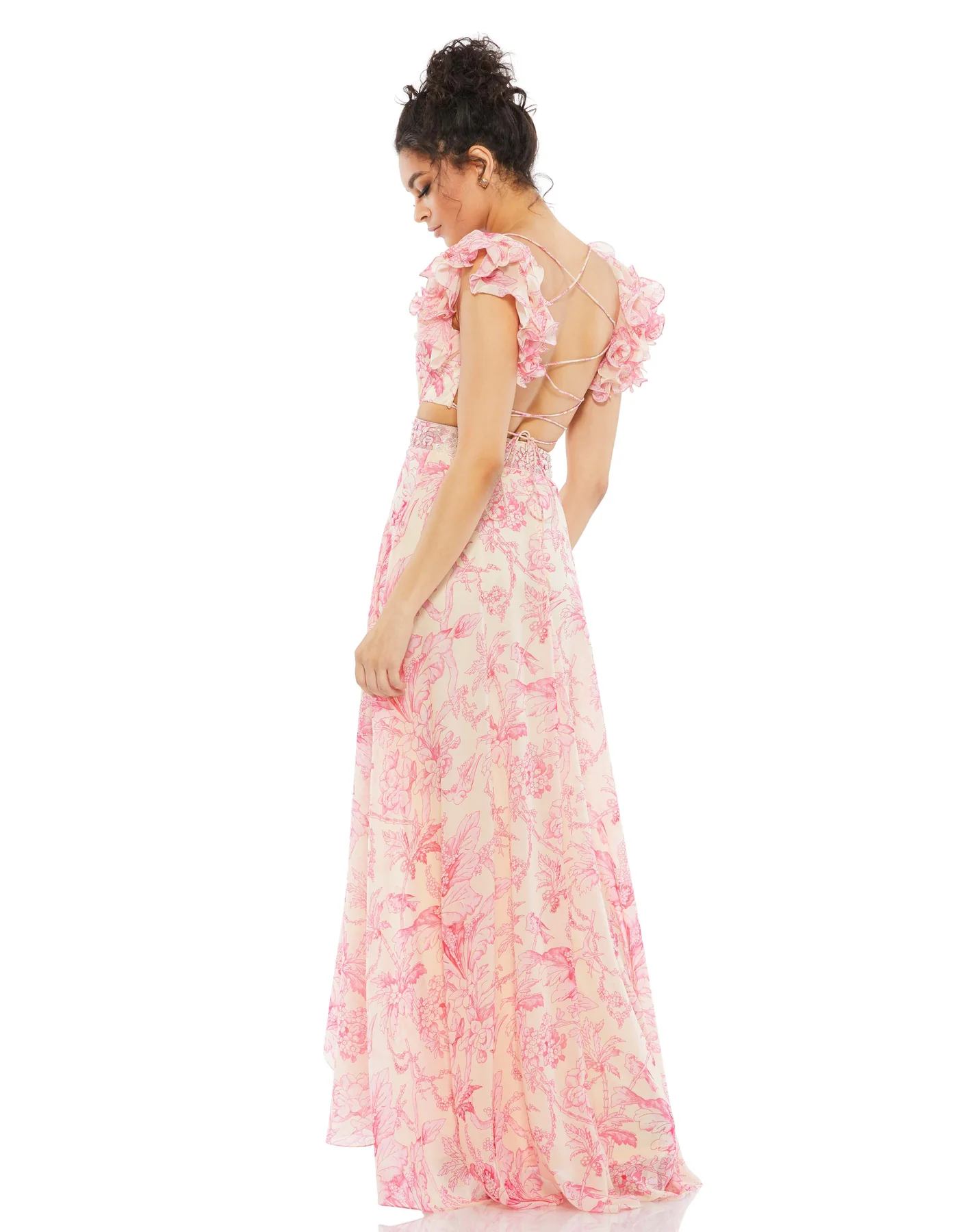 FLORAL PRINTED RUFFLE SHOULDER LACE UP GOWN