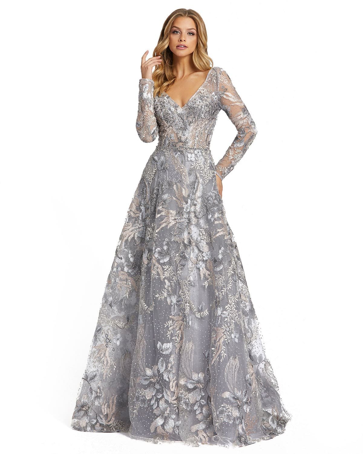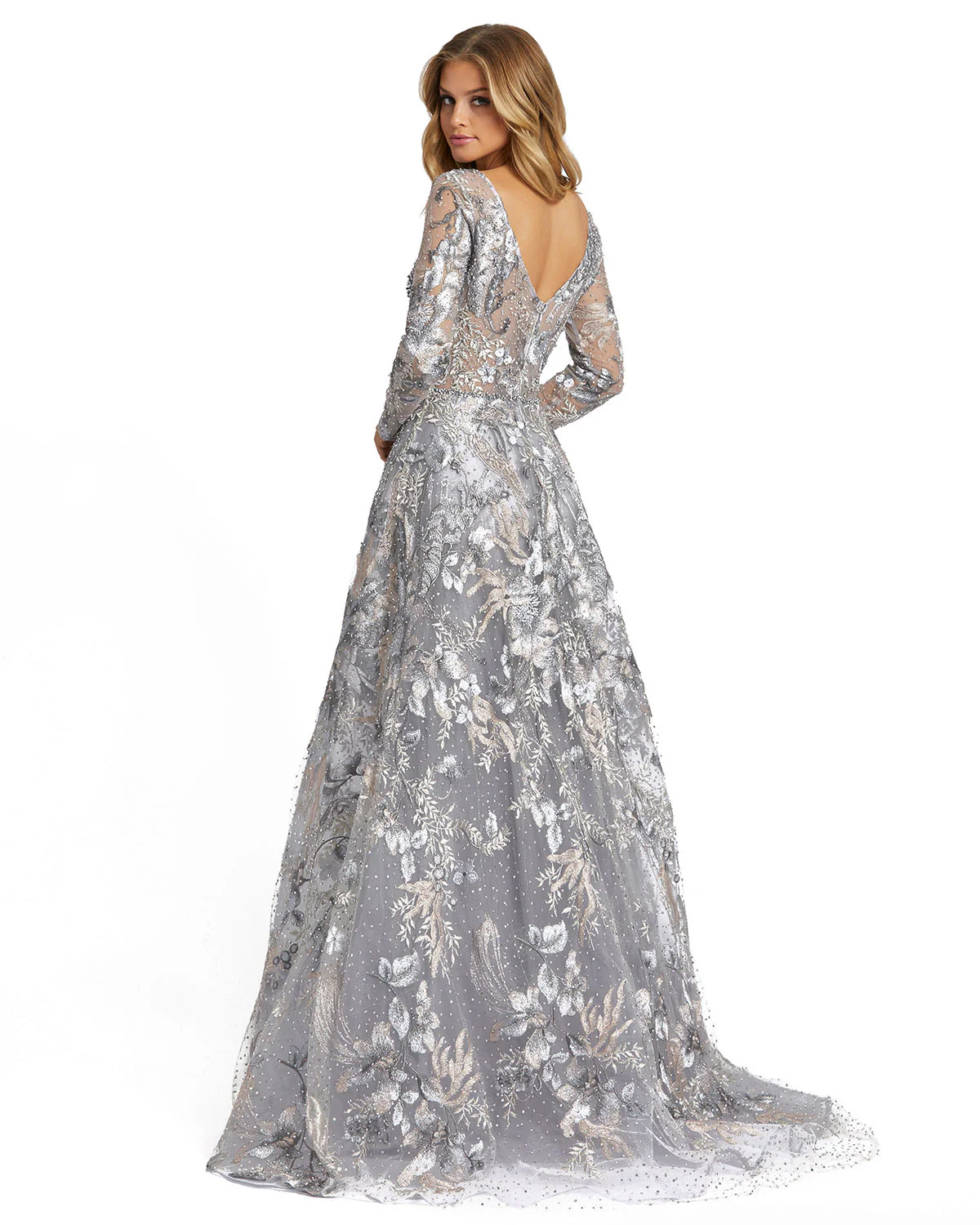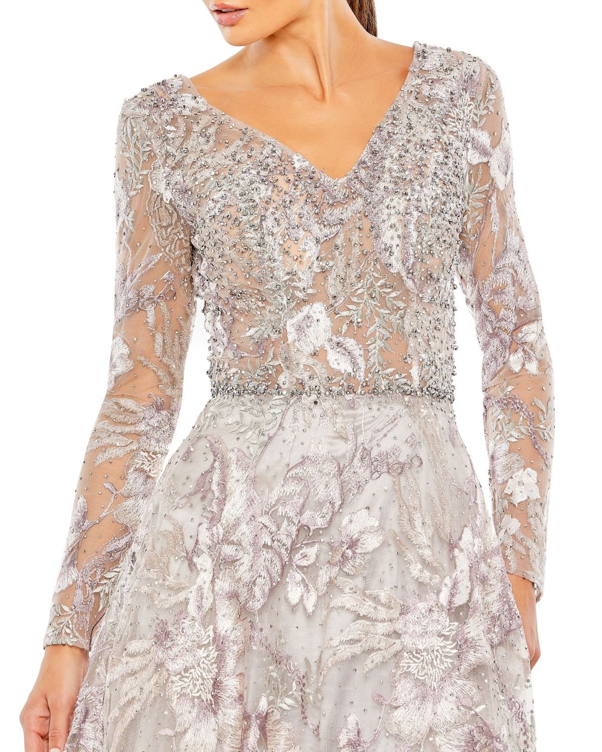 LONG SLEEVE BEADED APPLIQUE GOWN
