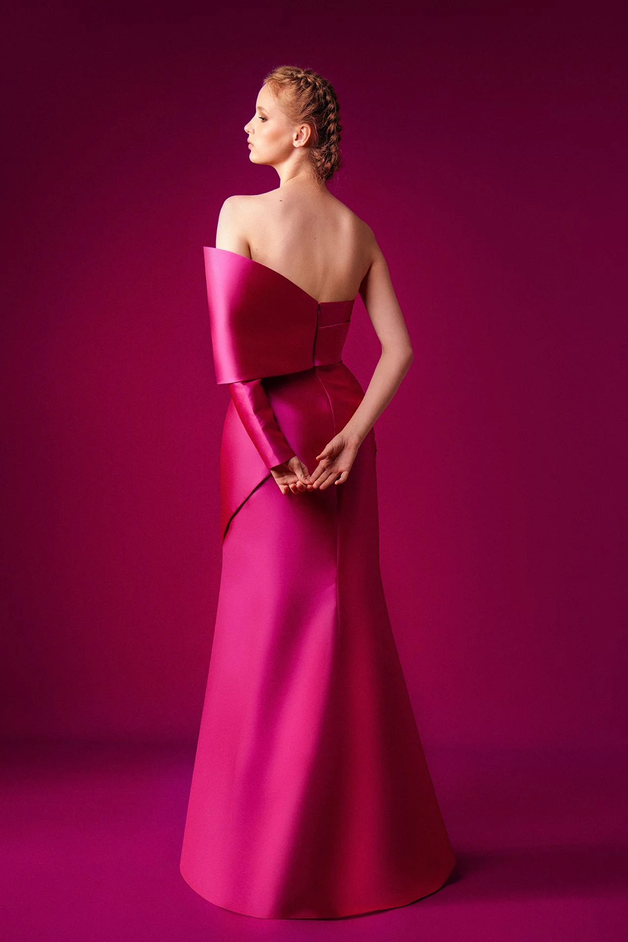One shoulder ruby cady evening dress with an asymmetrical bow on the bust that is elongated to the back, hiding one long sleeve that is adorned with a strip of buttons. Breathtaking bold floral red and green pattern embroidery at the side waist to enhance the hip shape. A stamina is added up to the seductiveness of this dress through its wrapped asymmetrical thigh-high slit that magnifies the allure of the overall body shape through an evening length. This classis yet feminine evening dress is suitable for all events to stand out of the crowd.