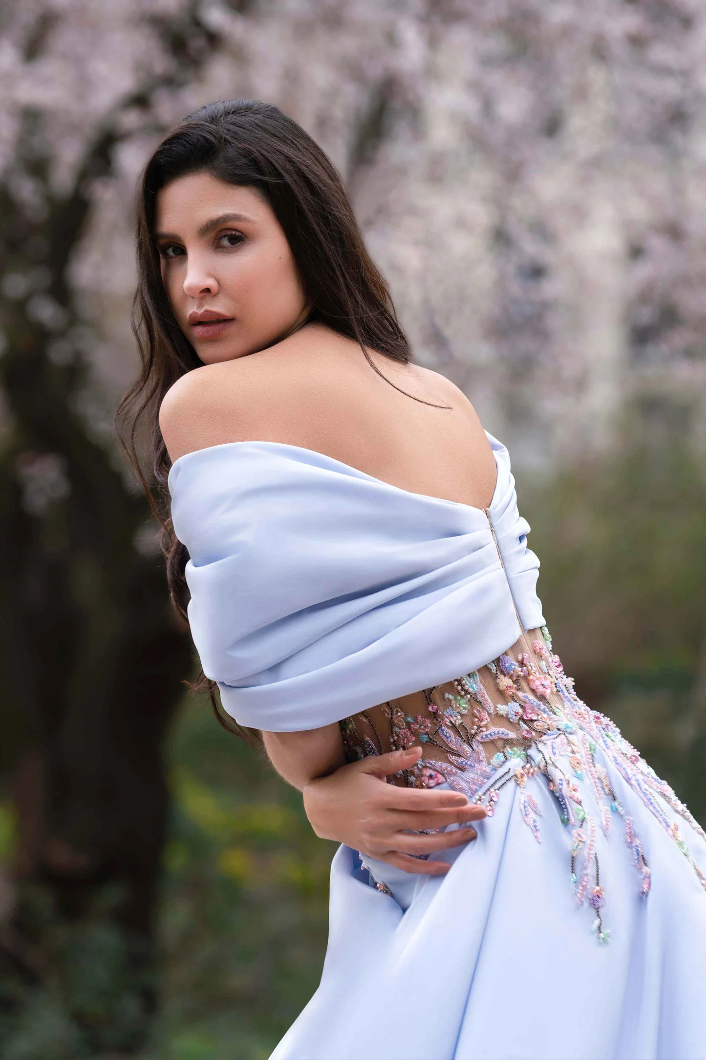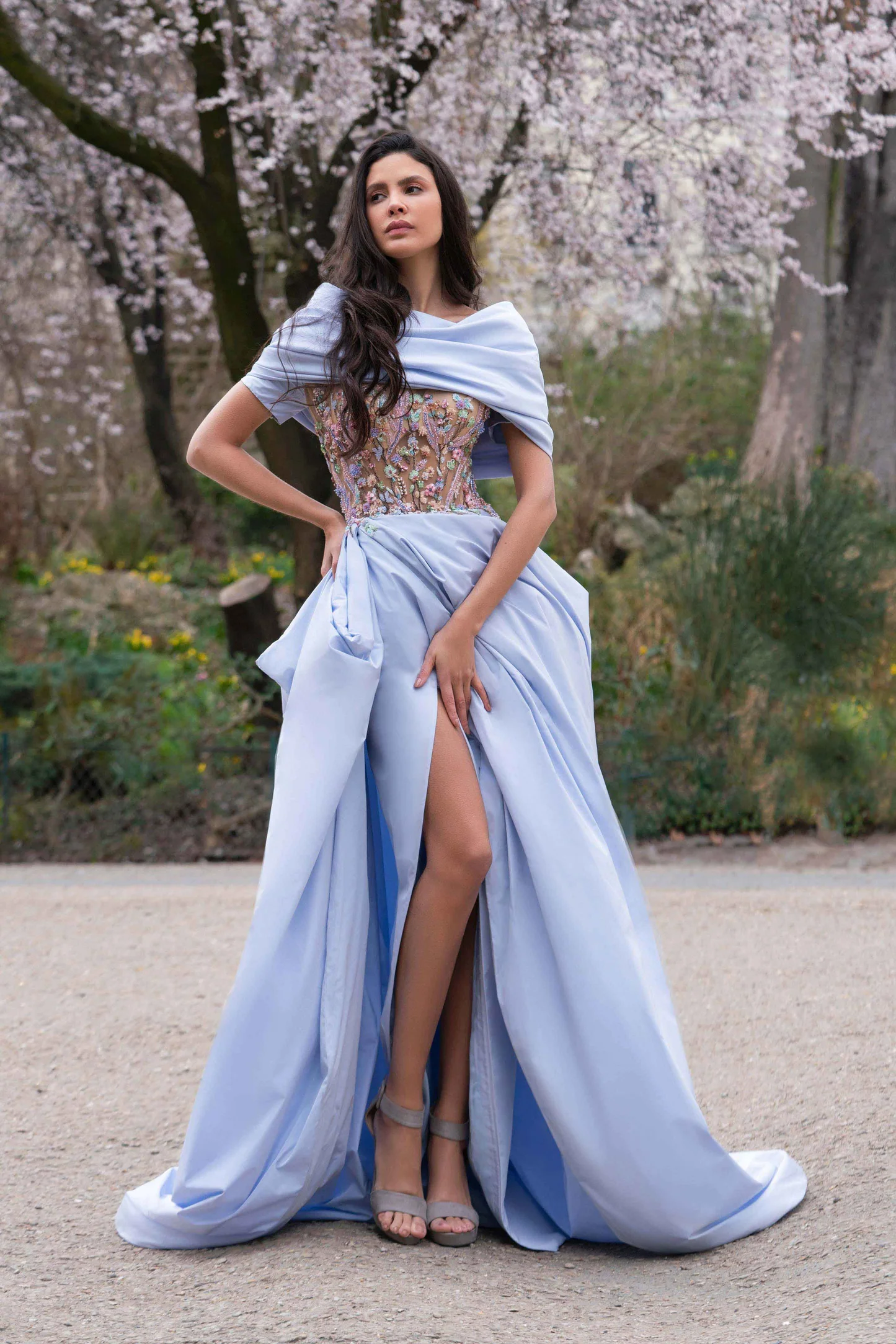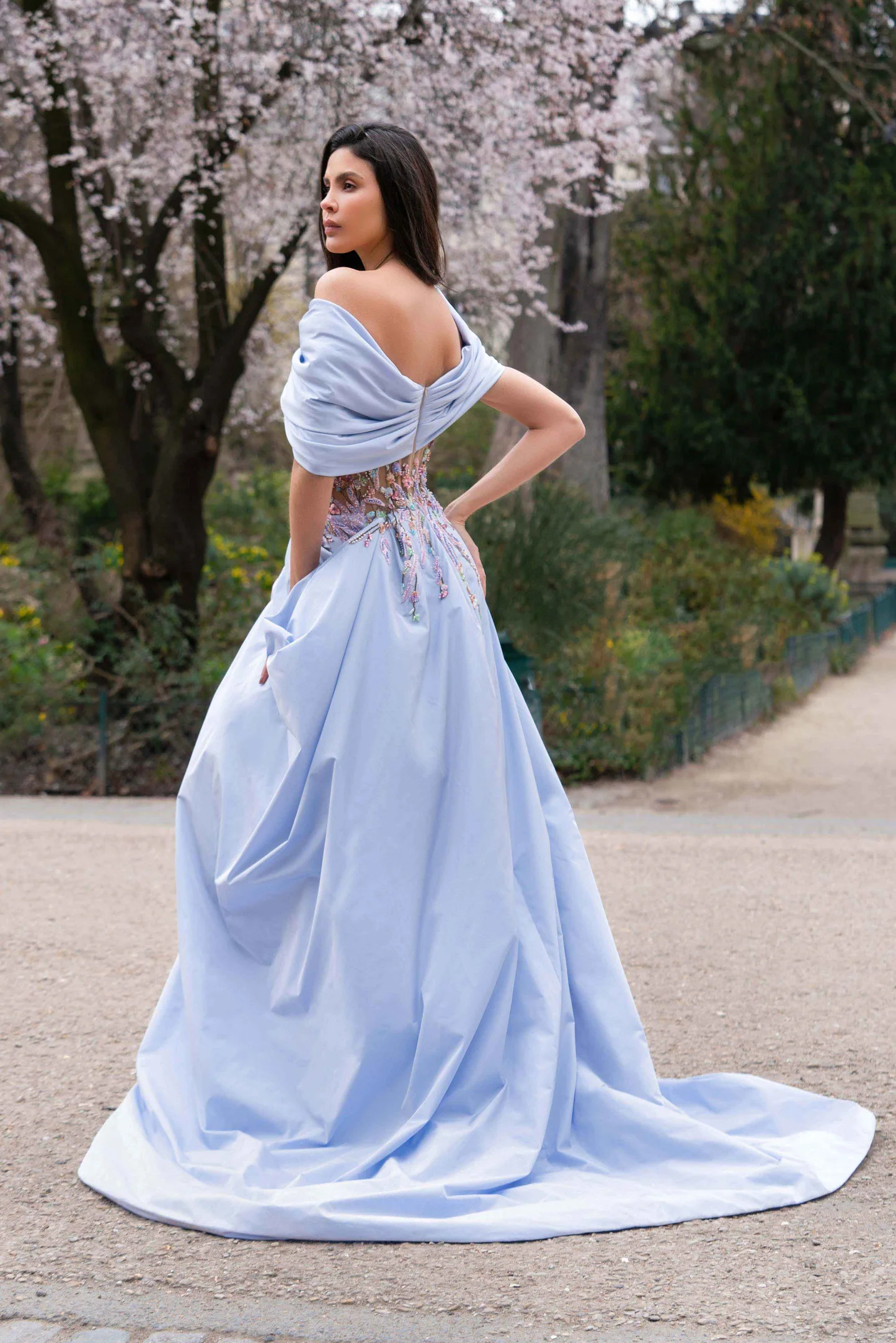 Draped off-shoulder soft blue taffeta evening dress embroidered with a multicolor floral corset ornamented with bold flower-patterned embroidery. This flowery pattern on the chest typifies resolution and attractiveness to give you a charming look and brighten up your occasion! This stunning evening dress is defined with an asymmetrical thigh-high slit to add drama. The back of the dress looks very sensual with its corset spreading its flower motifs on the taffeta gown before flowing to the floor in a chapel train.