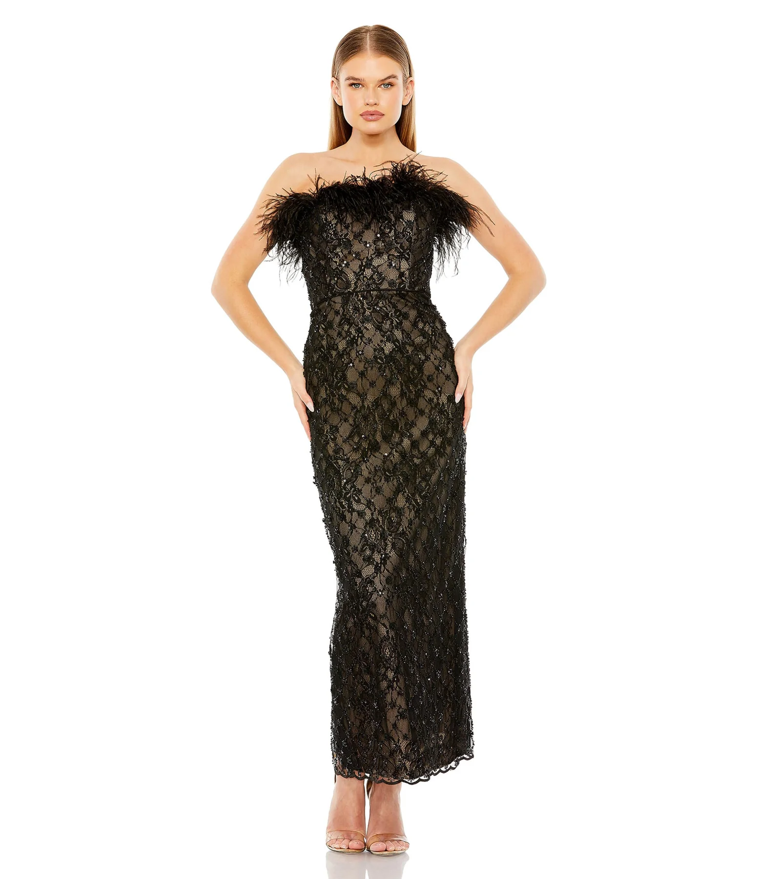 EMBELLISHED FEATHER STRAPLESS COLUMN DRESS