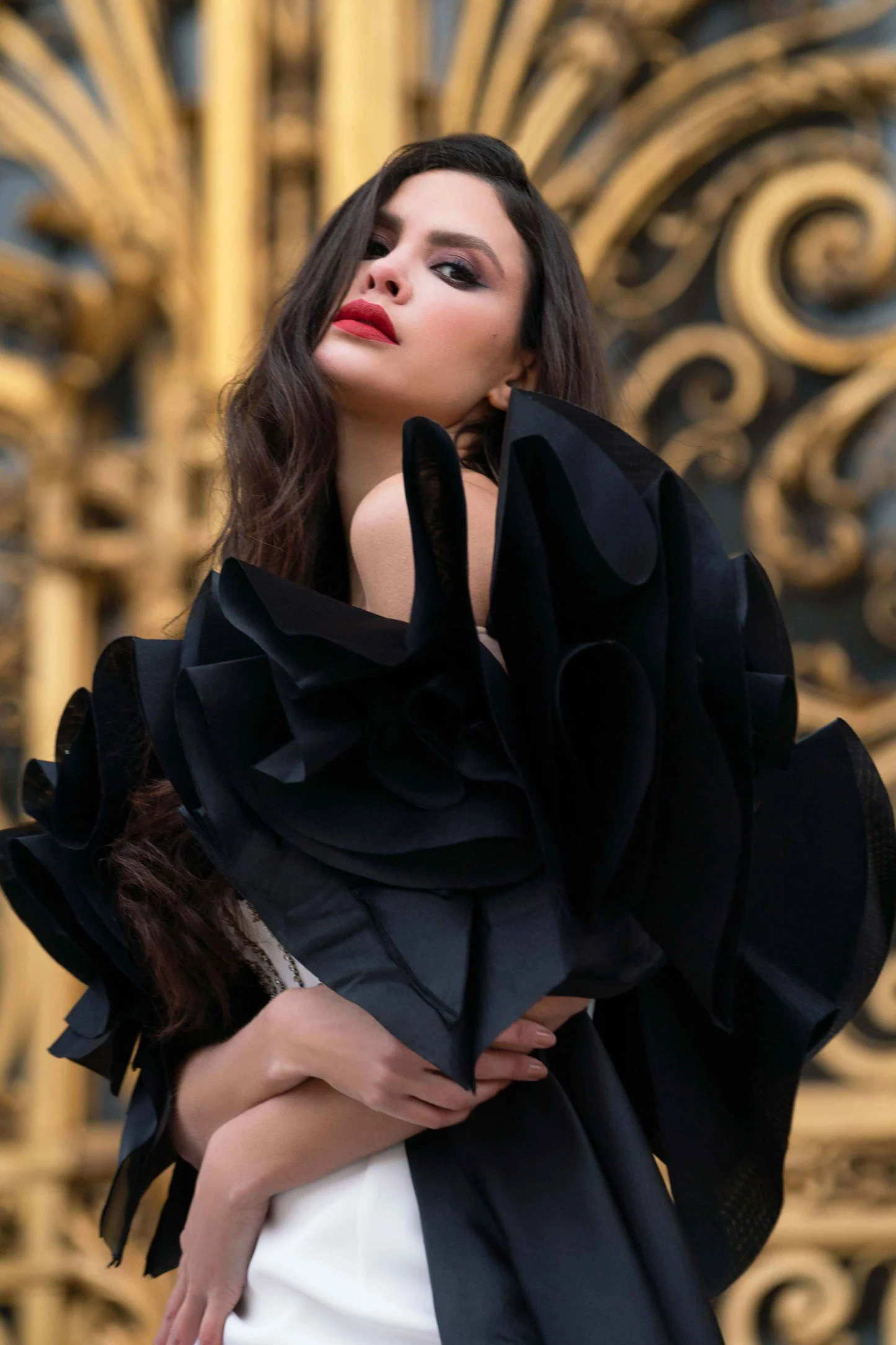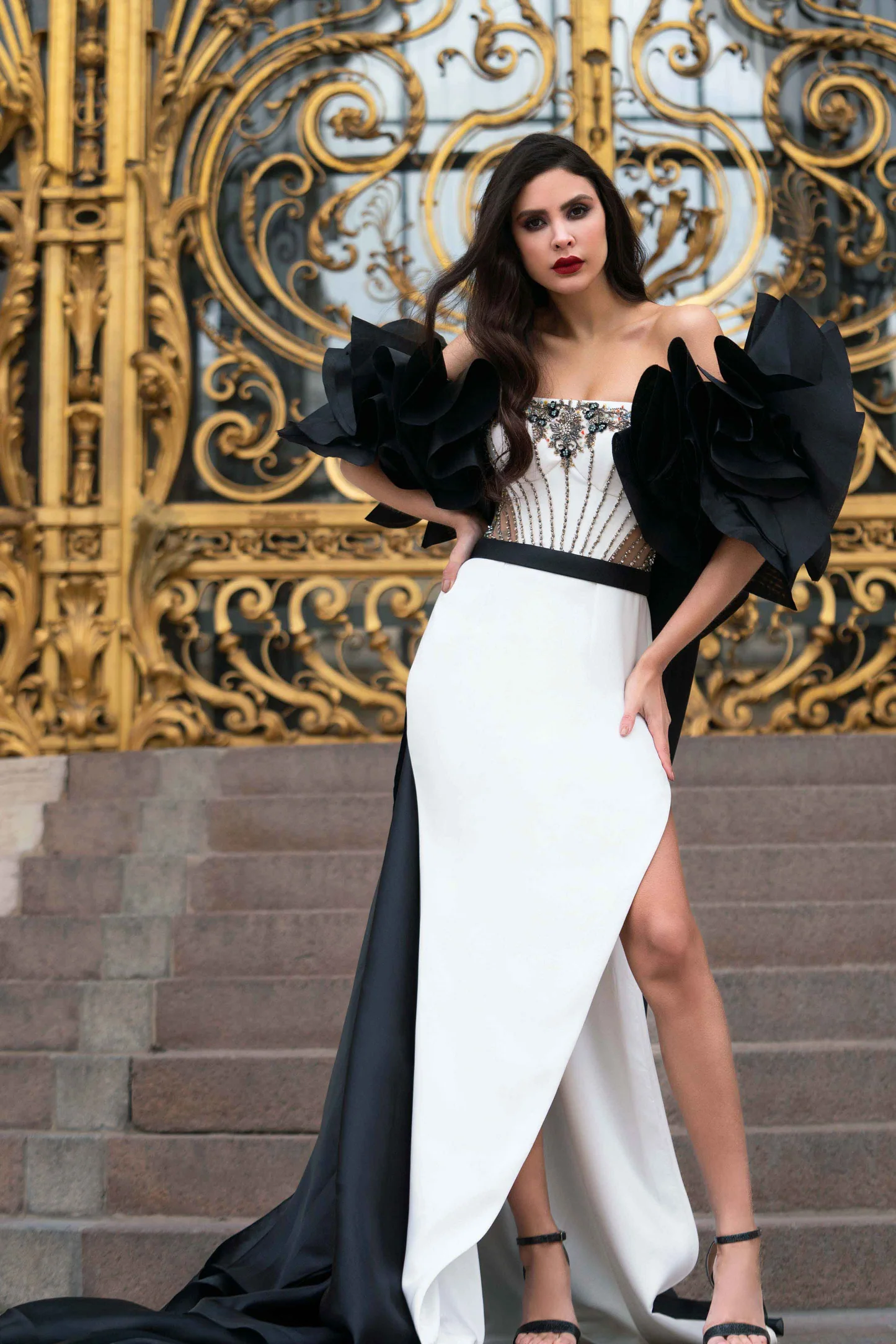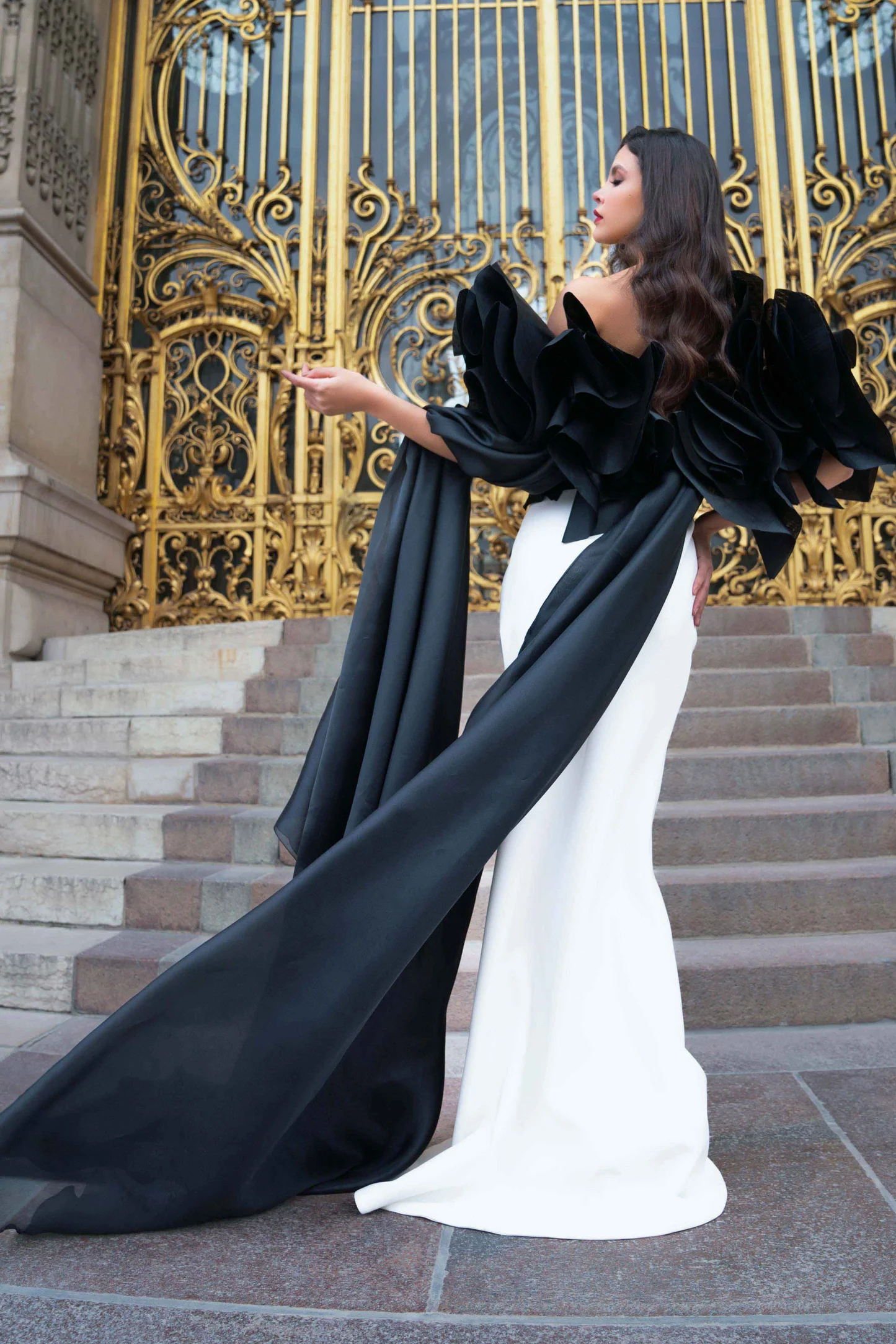 Off-shoulder asymmetrical off-white crepe evening dress designed in a corset decorated with bold silver strips on the chest. The evening dress is defined with a black belt on the waist, which makes it feel more elegant. The dress is completed with a luxuriant black organza flower cape with its wings flowing to the floor. These remarkable flowers are used to decorate and enrich the dress and add sophistication to your look. The back of the dress is covered with the large black organza flower and sweeps in a train that adds vibe during your dancing movement.