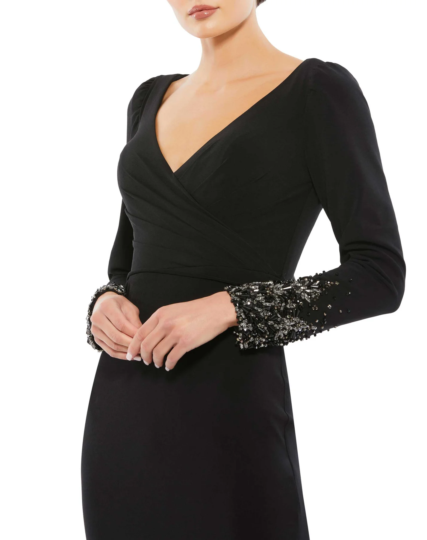 BEADED CUFF LONG SLEEVE WRAP OVER TRUMPET GOWN