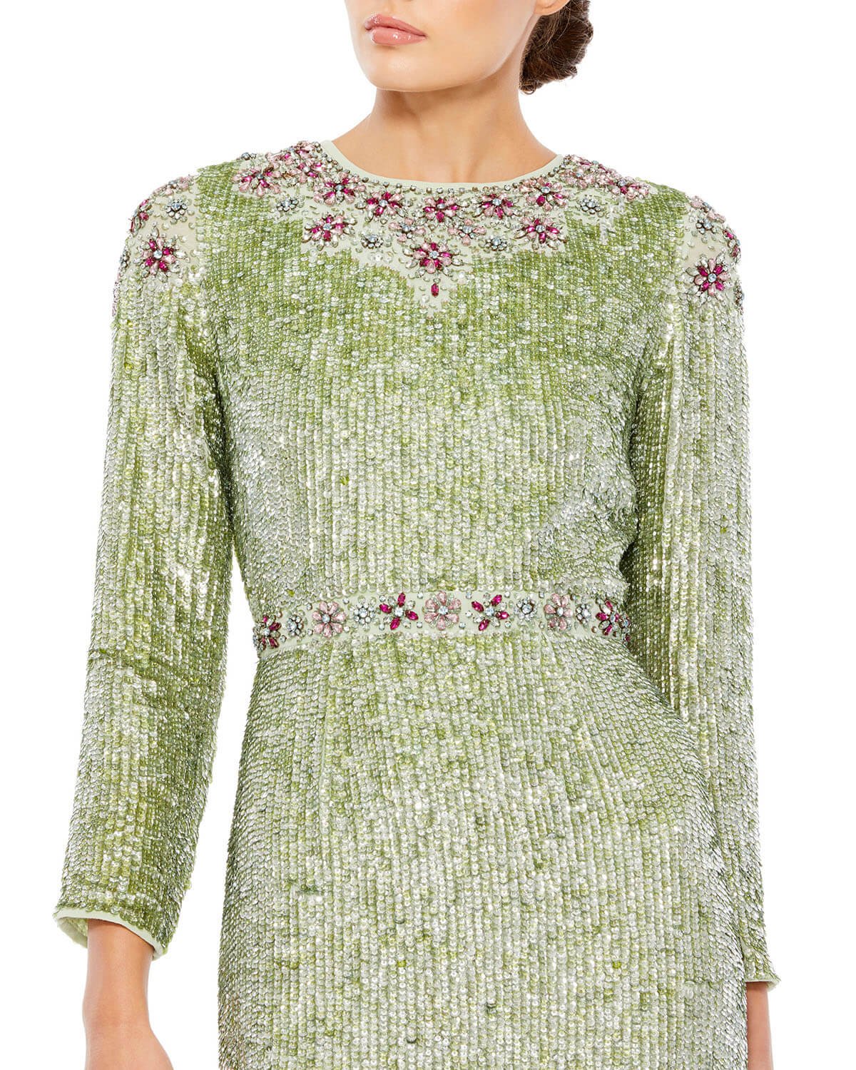 If a diamond necklace is your coveted accessory, then this decadent style is your wish list dress. The sensational dress is cut in a modest midi sheath completely covered in sequins that add texture and shine. Bloom-arranged jewels glitter at the collar, shoulders, and waist in a belt-like accent.