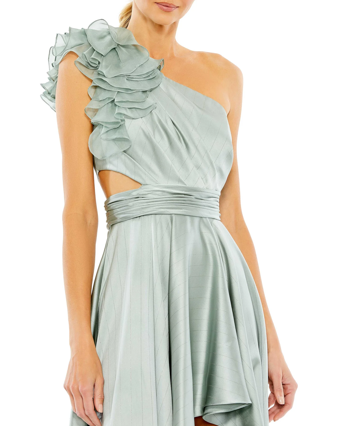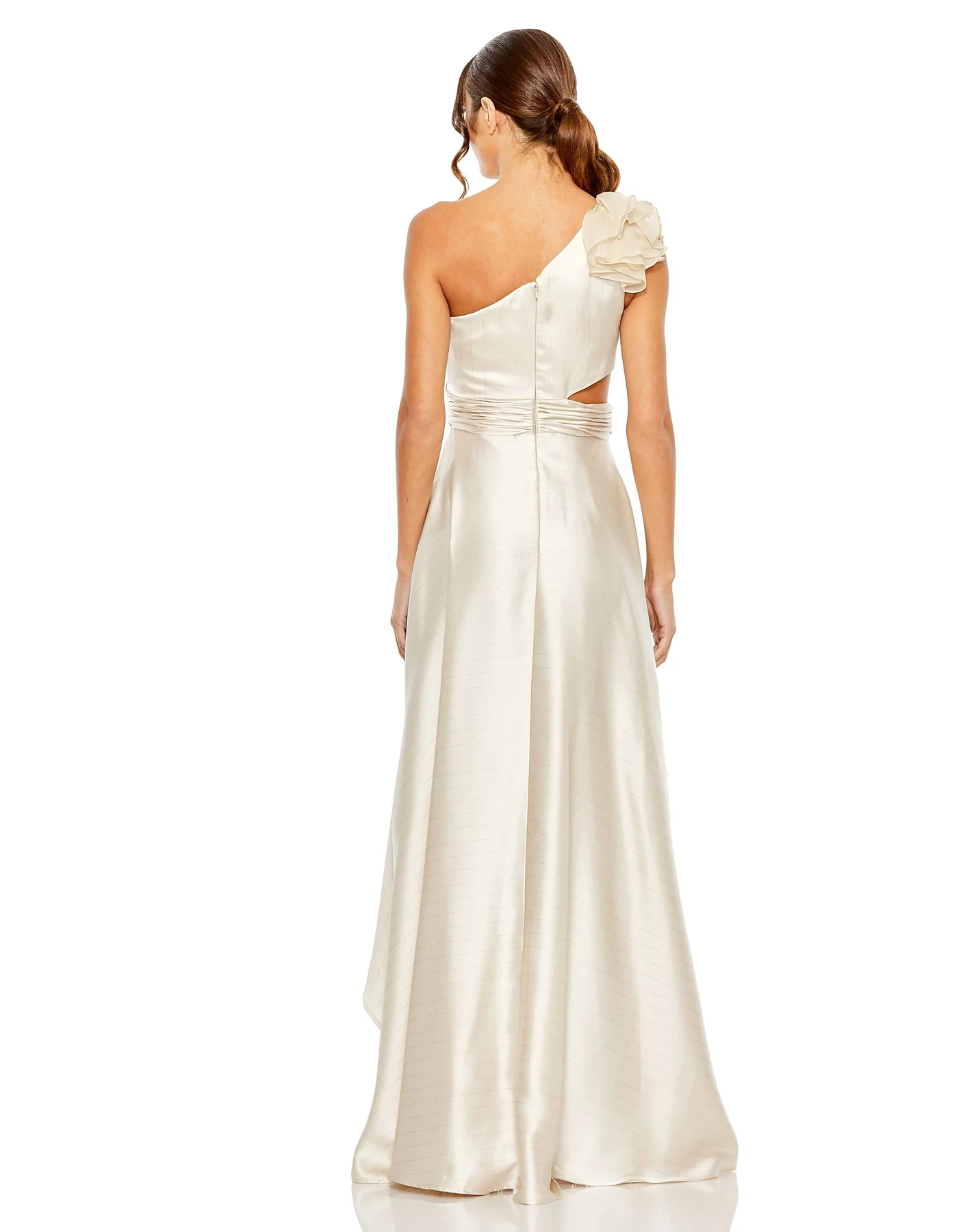 RUFFLED ONE SHOULDER CUT OUT HI-LOW GOWN