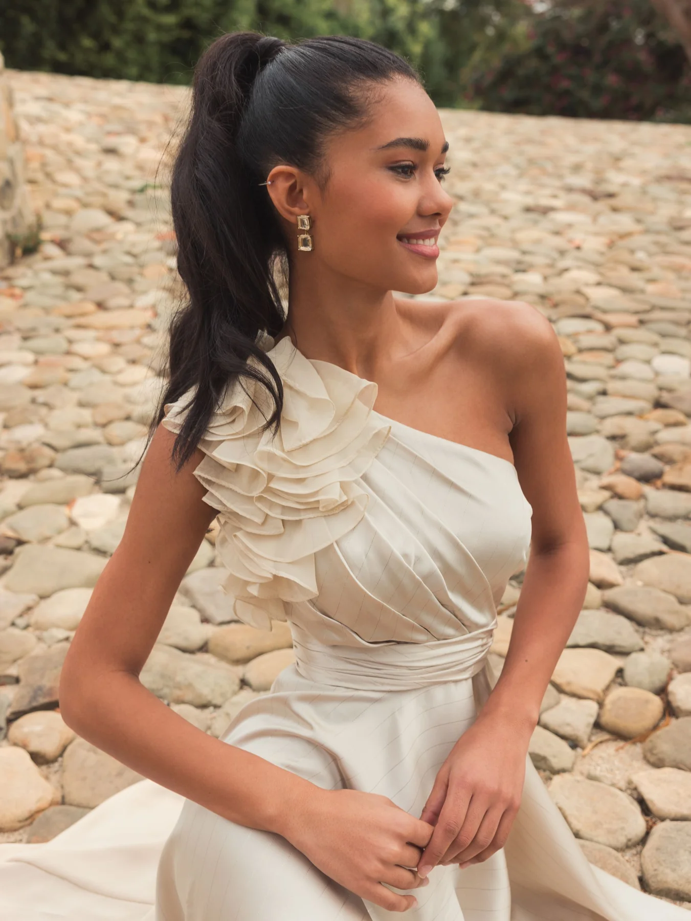 - Asymmetrical one shoulder neckline