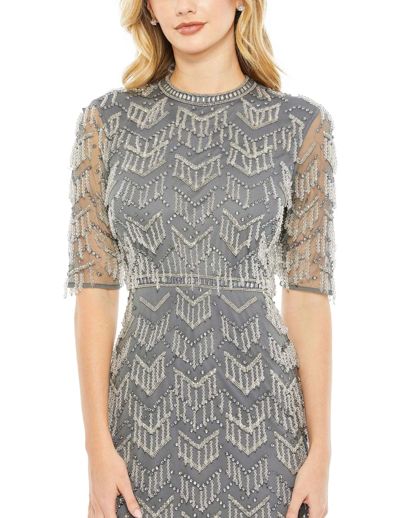 BEADED FRINGE QUARTER SLEEVE COLUMN GOWN