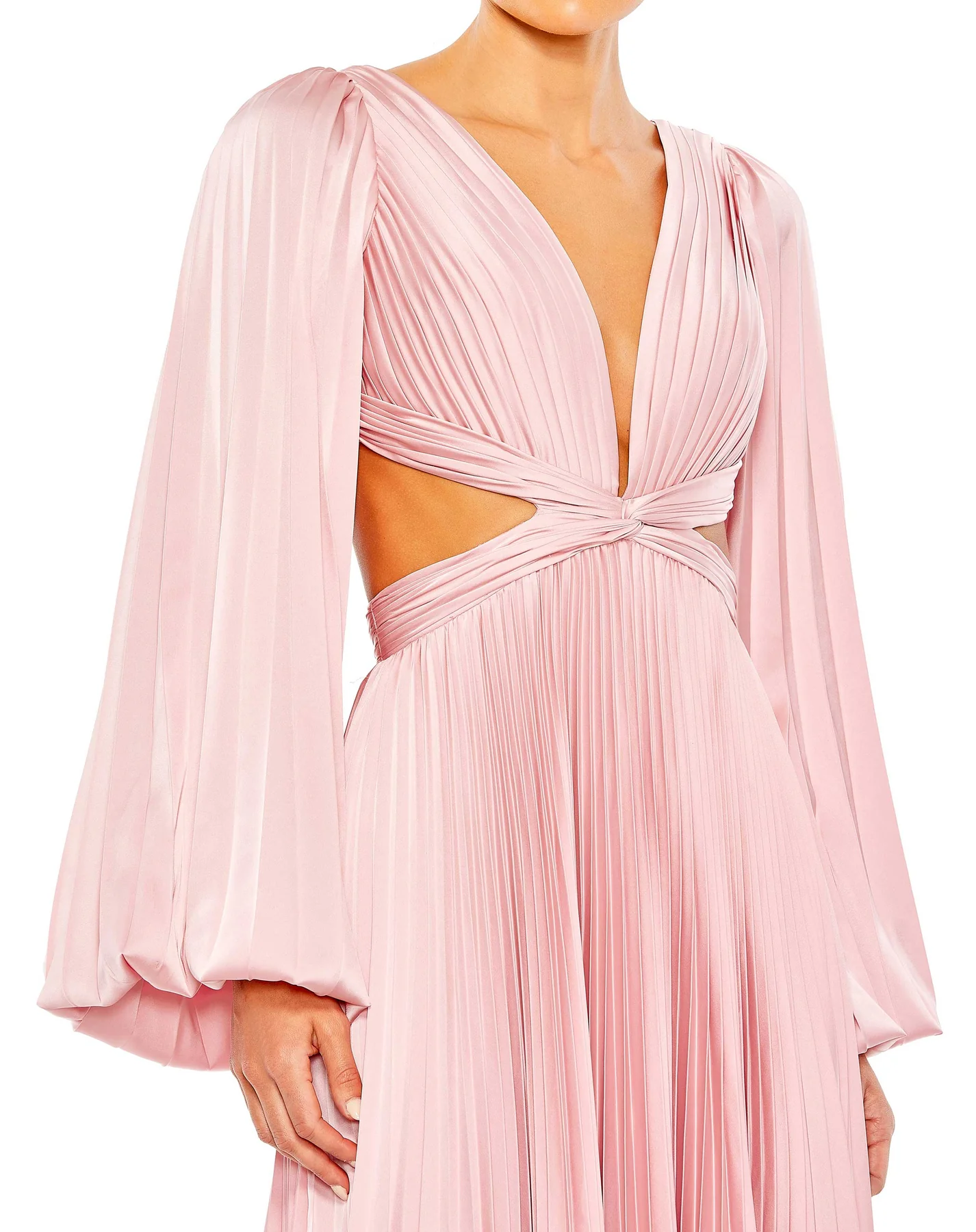 LONG SLEEVE PLEATED CHARMEUSE CUT OUT GOWN