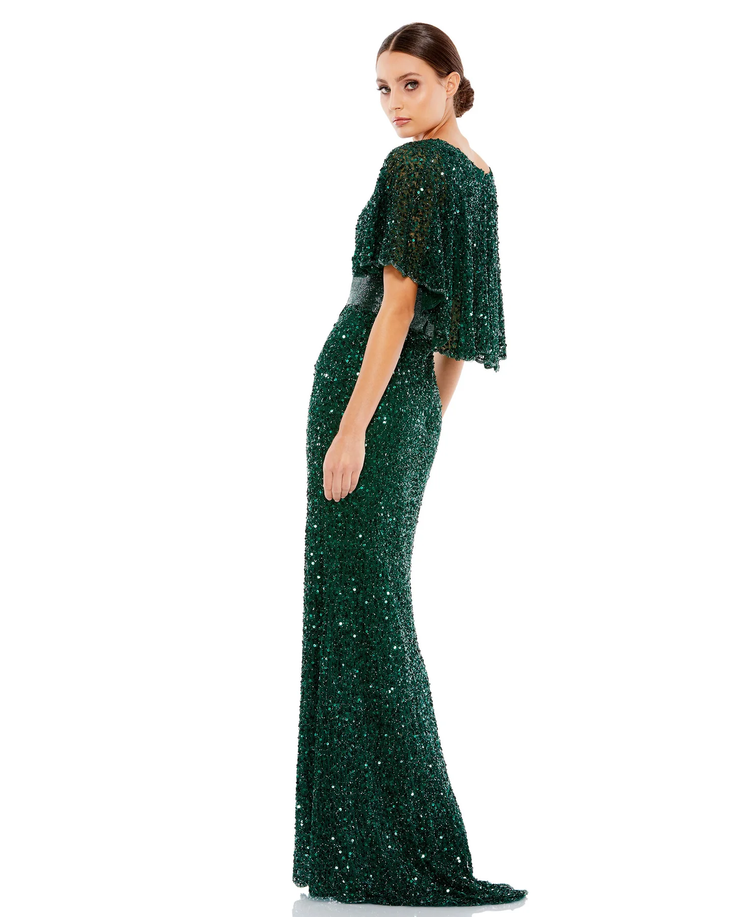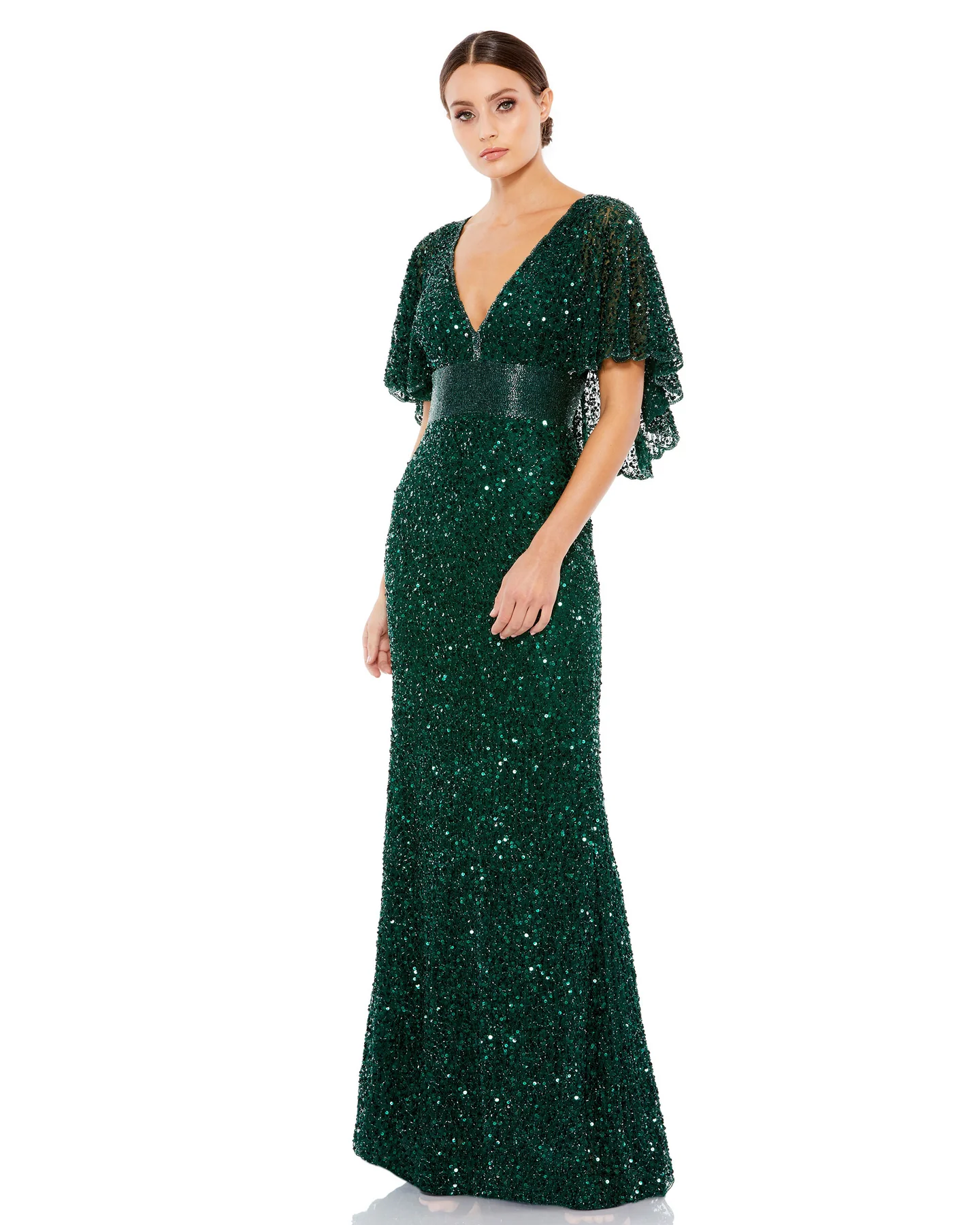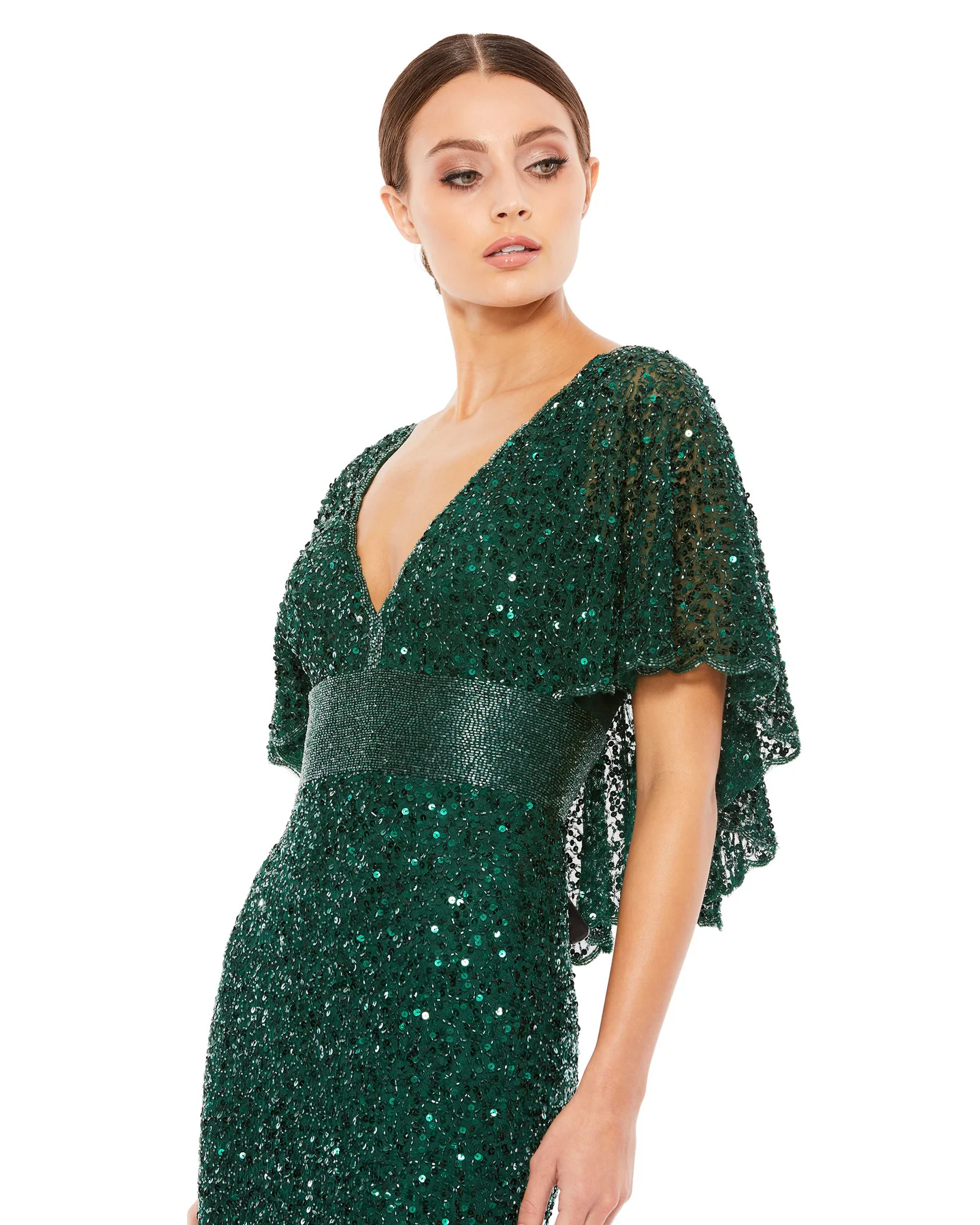 SEQUINED V-NECK CAPE SLEEVE BEADED WAIST GOWN