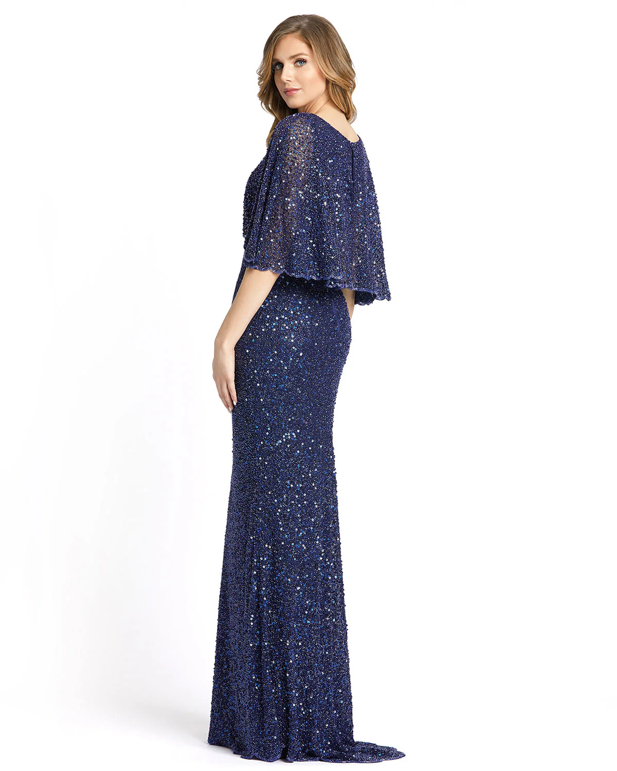 Elegant fully-sequined gown with a plunging scalloped v-neckline, bell sleeves, cape-style back, and a dramatic hand-beaded waist.