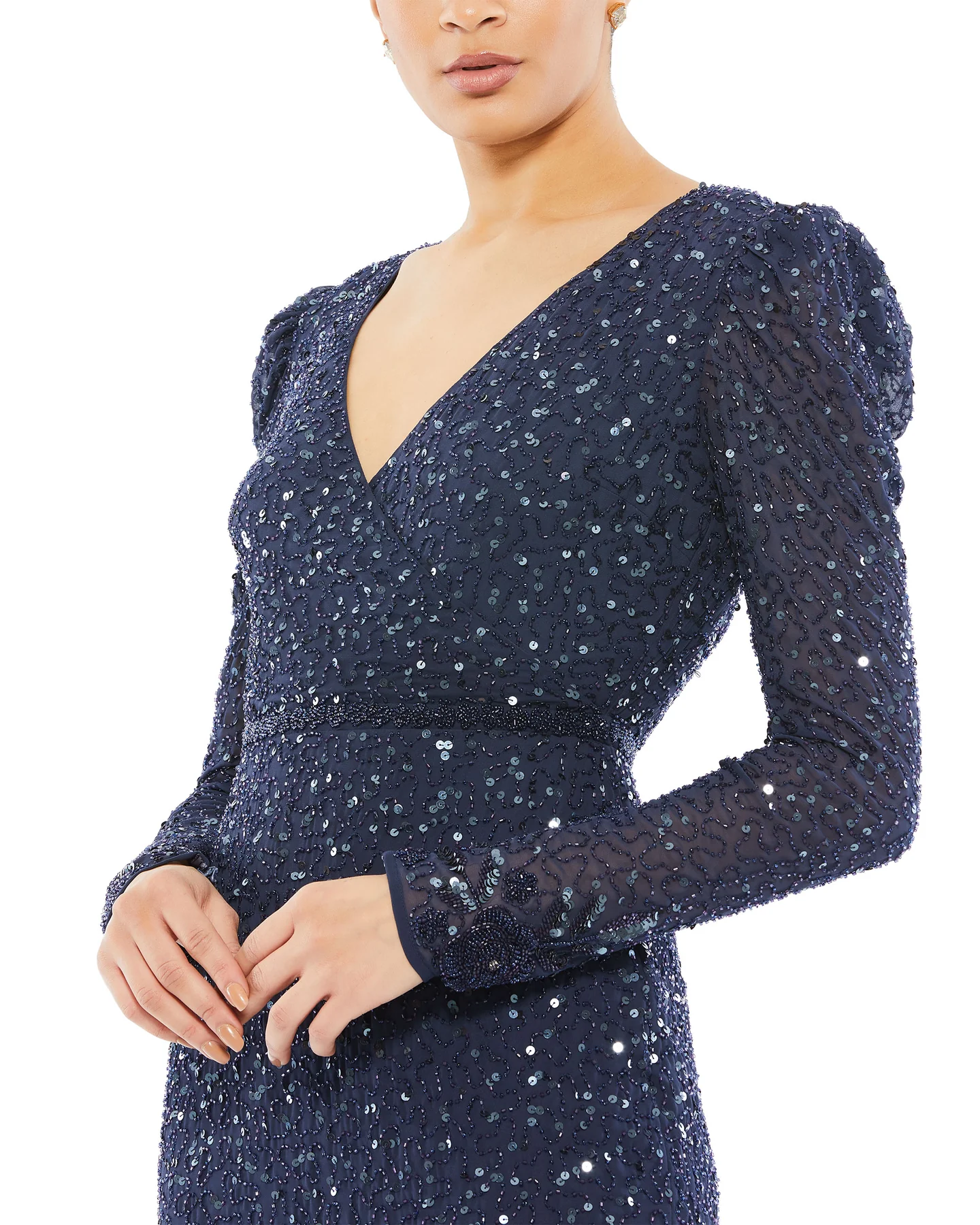 Elegant long-sleeved sequined cocktail dress with a faux-wrap v-neckline, fitted bodice, trumpet hem, and hand-beaded detail at the natural waist.