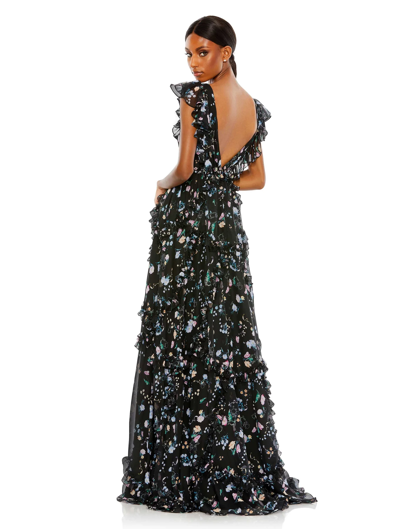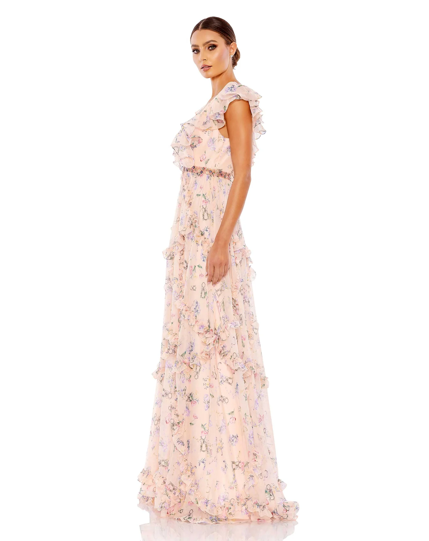 Inspired by Victorian glamor, this gown is cut from charming bloom-print chiffon, decked with girlish ruffled trim, and finished with a sweep train. A deep V-neckline and coordinating plunge back make the dress perfect for modern-day galas and special occasions. We especially love the multicolor jeweled band that delivers luxe shine.