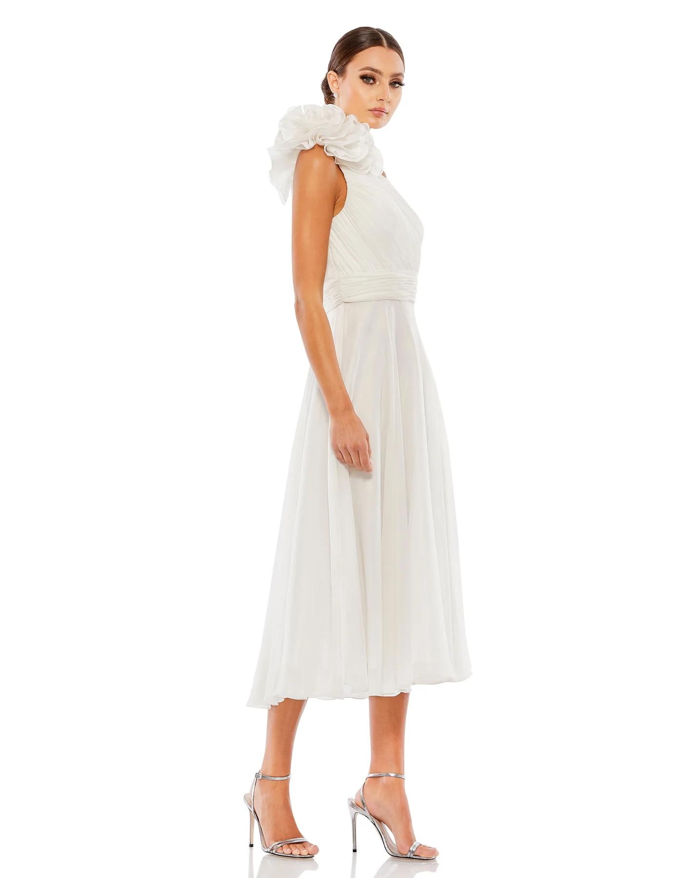 ROSETTE ONE SHOULDER TEA LENGTH DRESS