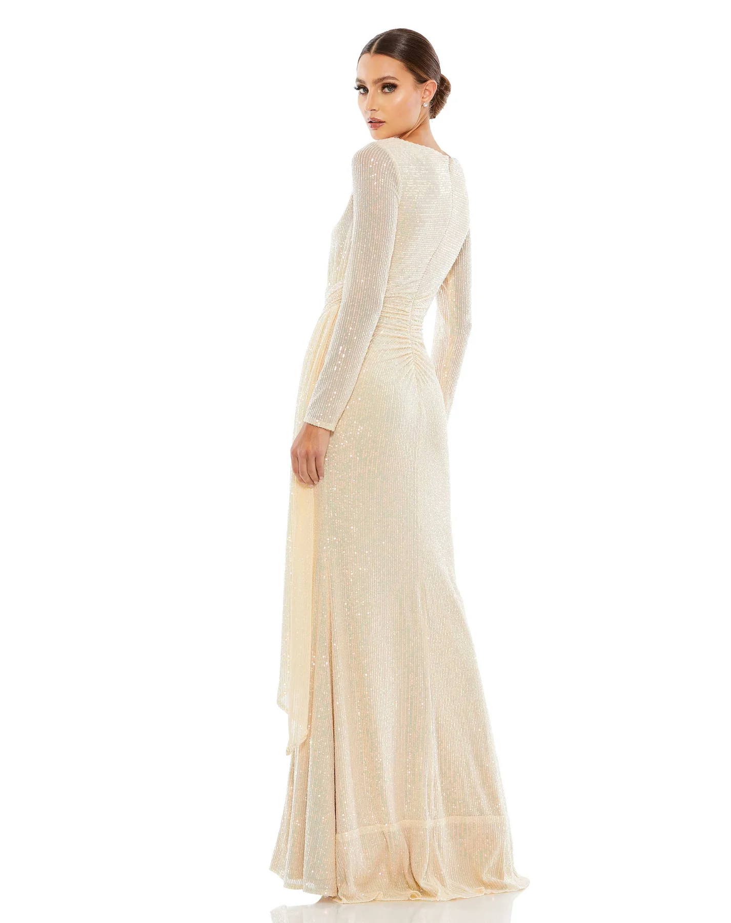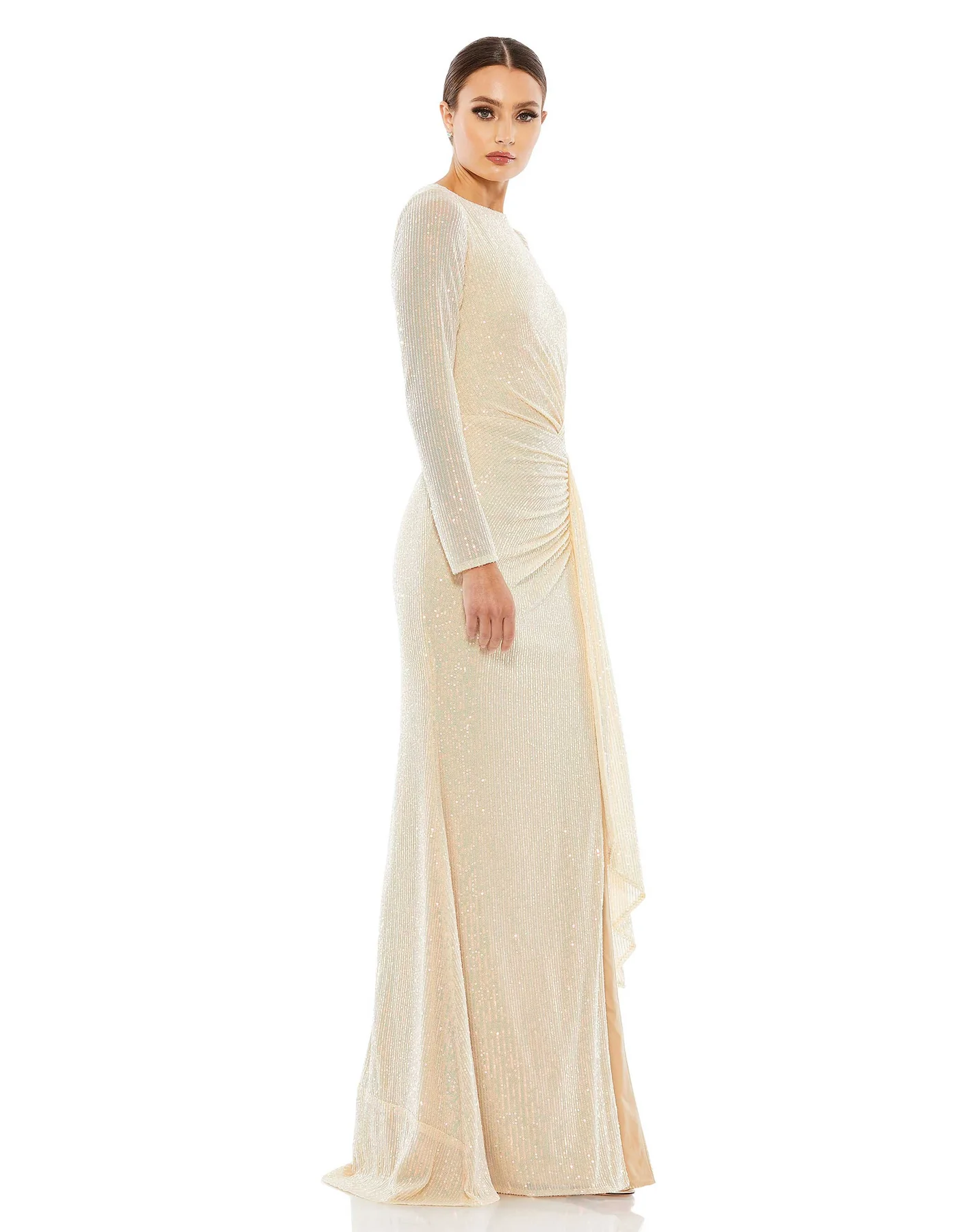 SEQUINED RUCHED LONG SLEEVE BOAT NECK GOWN