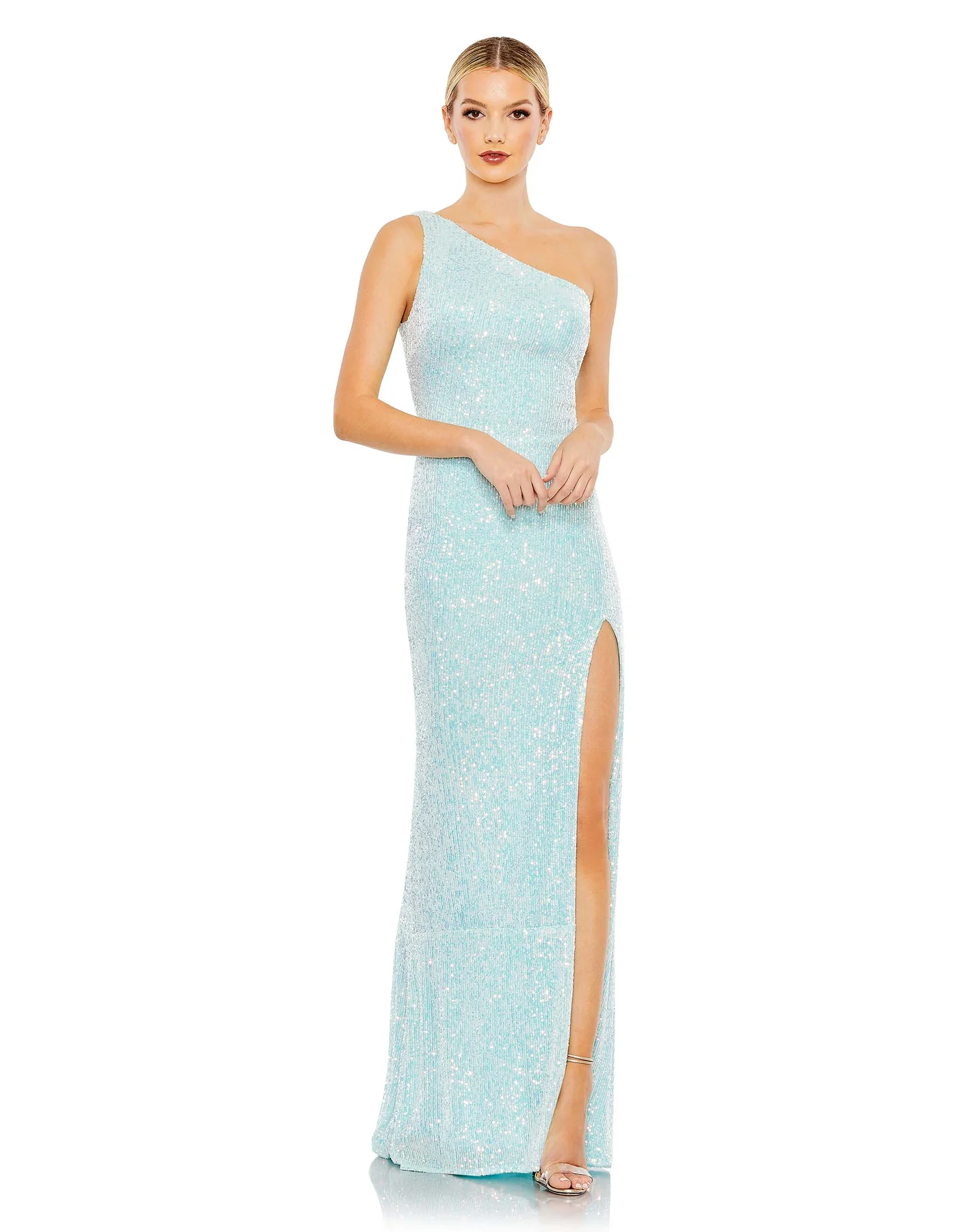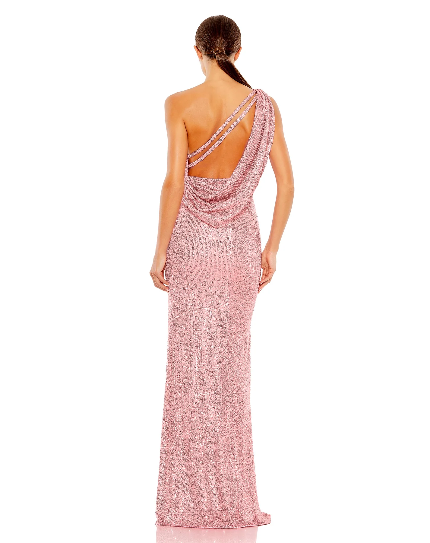SEQUINED ONE SHOULDER DRAPED BACK GOWN