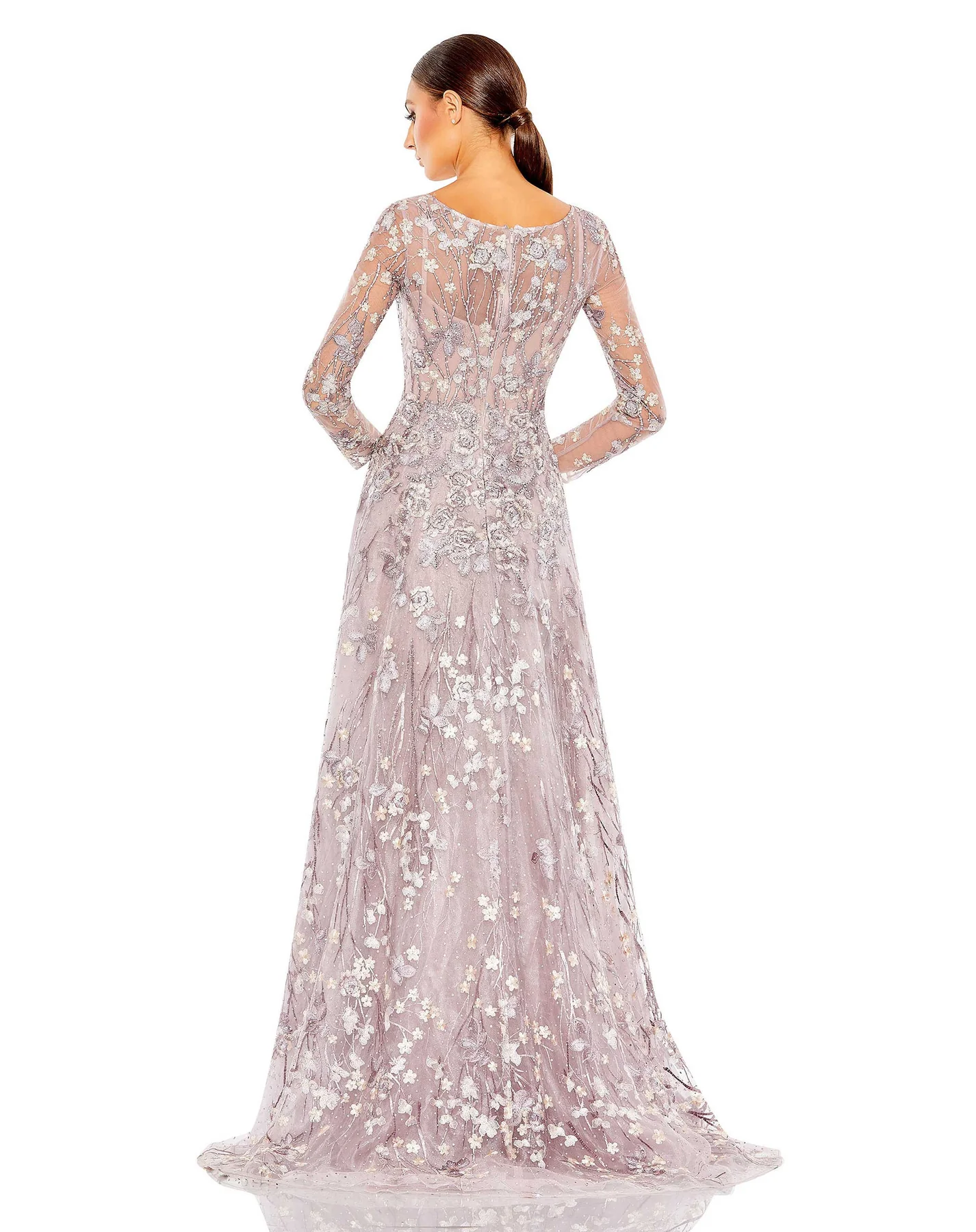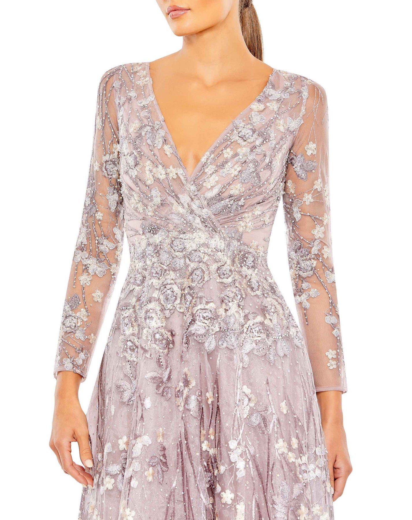 EMBELLISHED WRAP OVER ILLUSION LONG SLEEVE A LINE GOWN